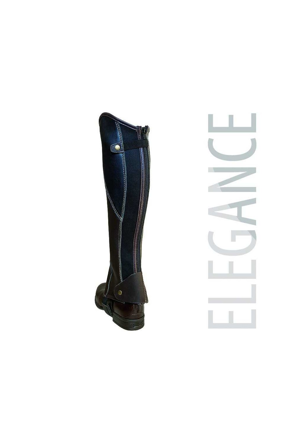 Elegante polaina bicolor realizada en cuero suave y flexible que se adapta perfectamente a la pierna gracias a su diseño y al elástico posterior. Con cremallera completa y dos solapas con botones de presión. Acabado en bonita combinación de dos colores de cuero, negro y marrón. Puntadas en contraste.