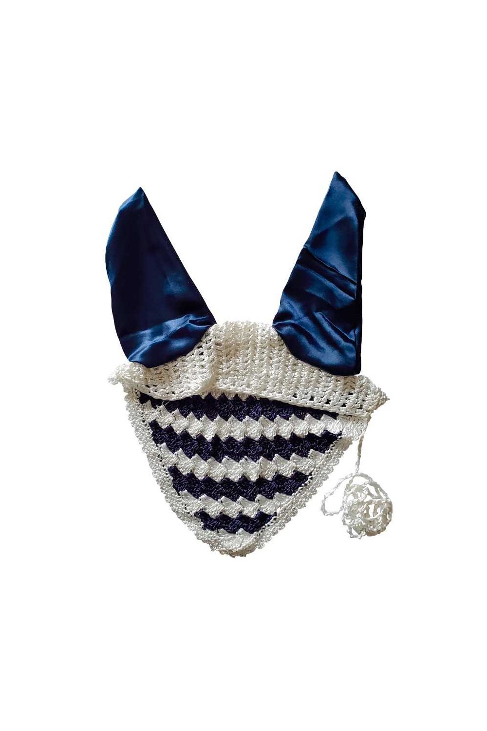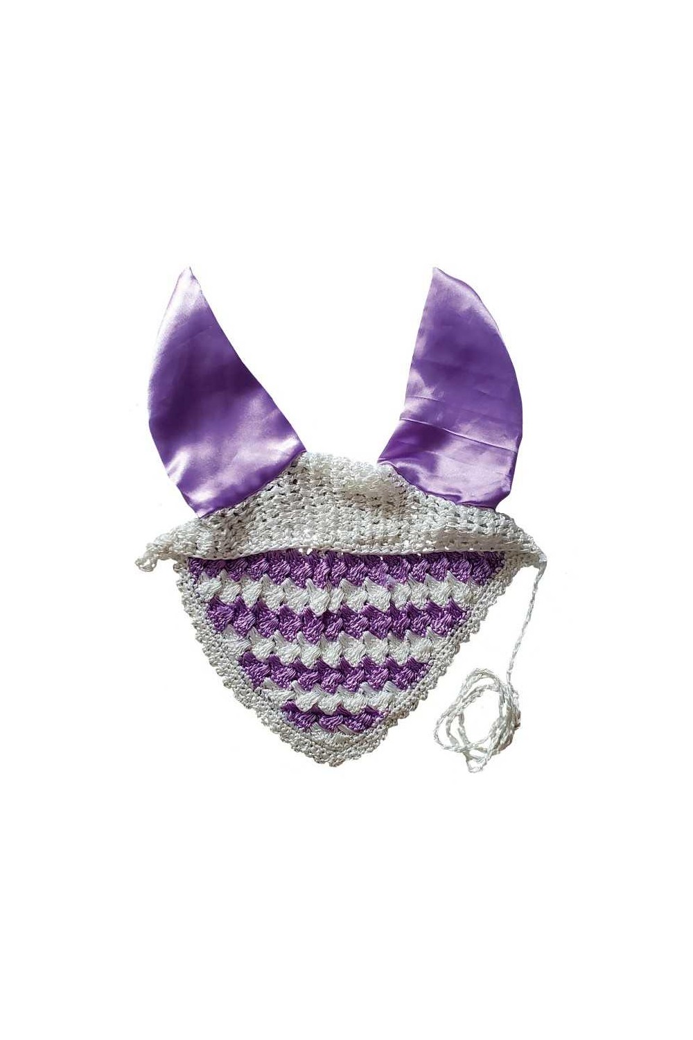 Mosquero para caballo realizado en crochet con cubreorejas de raso, para proteger al caballo de las molestas moscas.