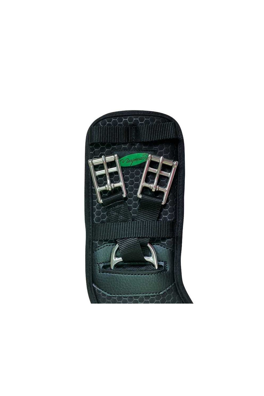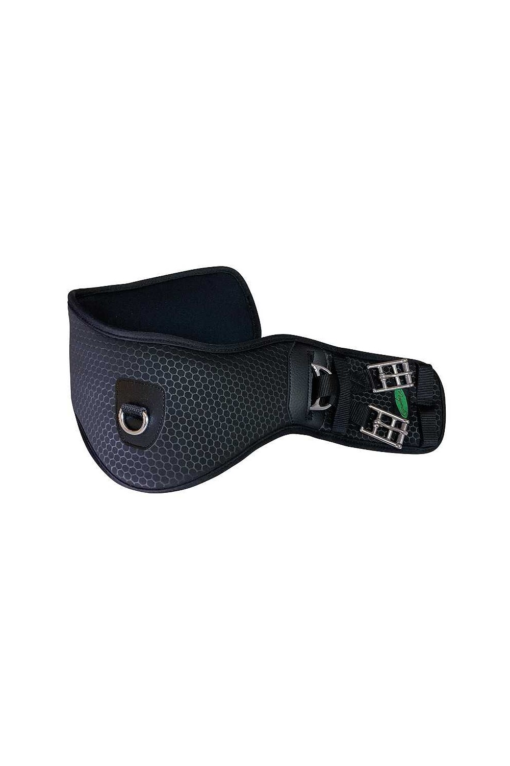 Cincha de doma con forma curvada diseñada para aliviar presiones en el caballo.