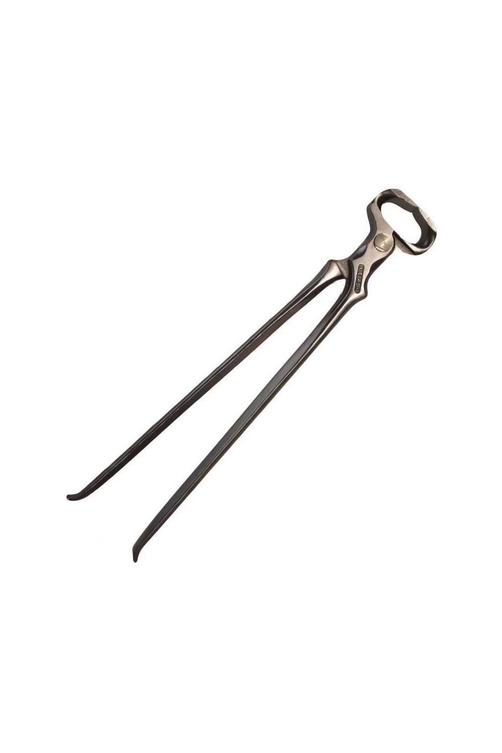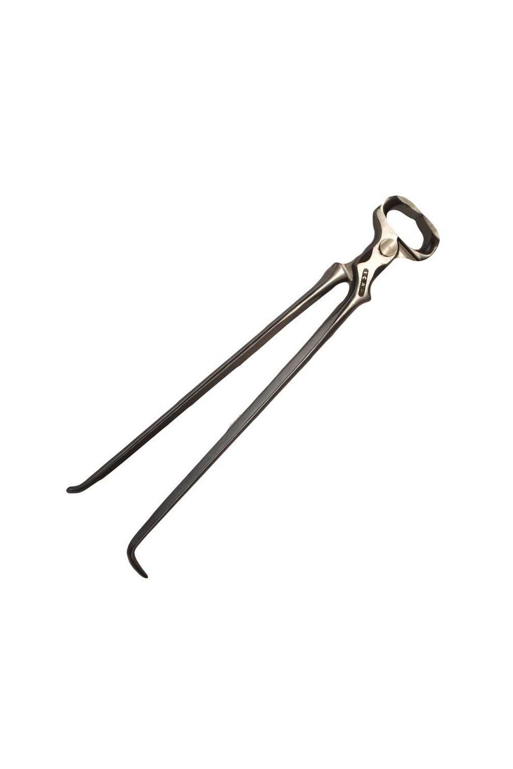 Tenaza con tres funciones:    a) Desherrar    b) Abrir herraduras    c) Cortar clavos. Longitud: 14"/350 mm Peso: 760 gramos