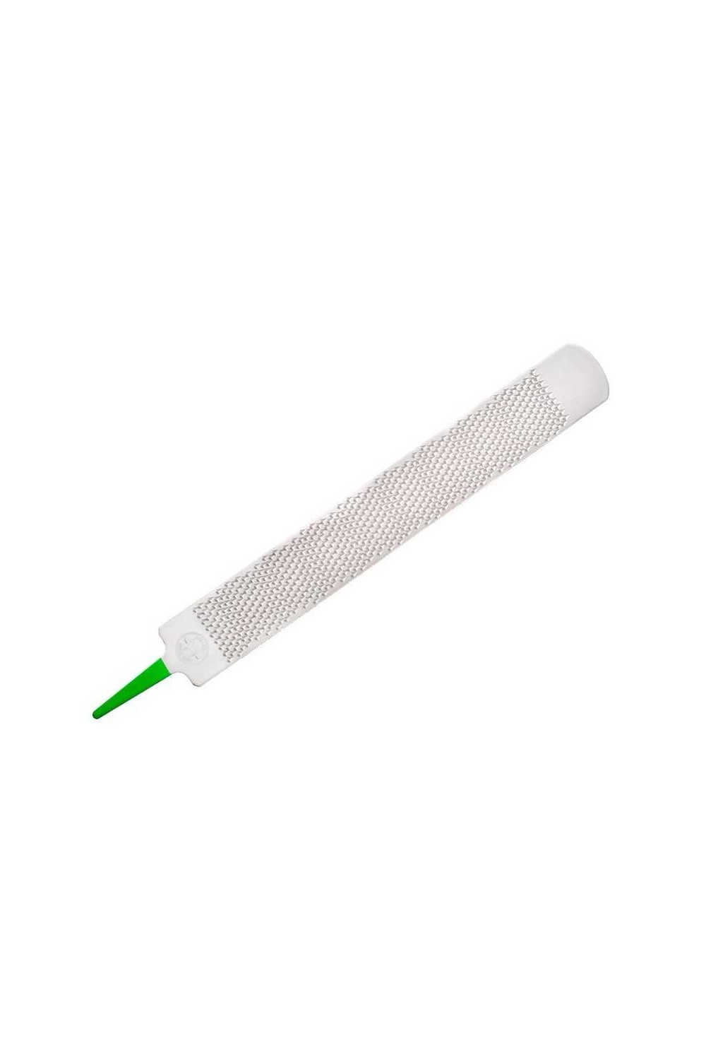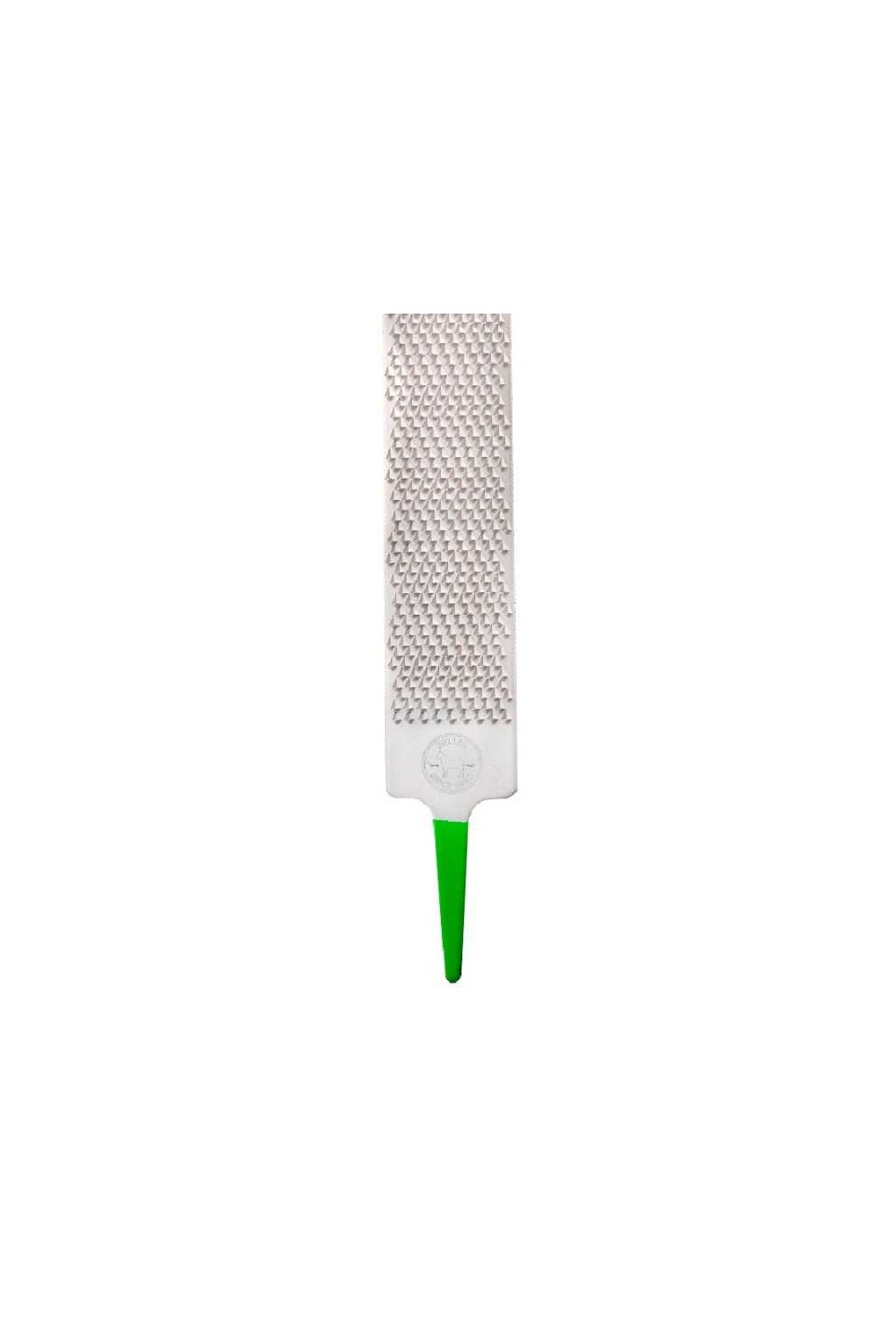 Esta escofina tiene 657 dientes afilados divididos en 73 filas sobre una superficie de 50 mm de ancho. El lado grueso elimina la pezuña al instante y se complementa perfectamente con el lado fino multideslizante que proporciona un excelente acabado similar al vidrio a la pezuña.
