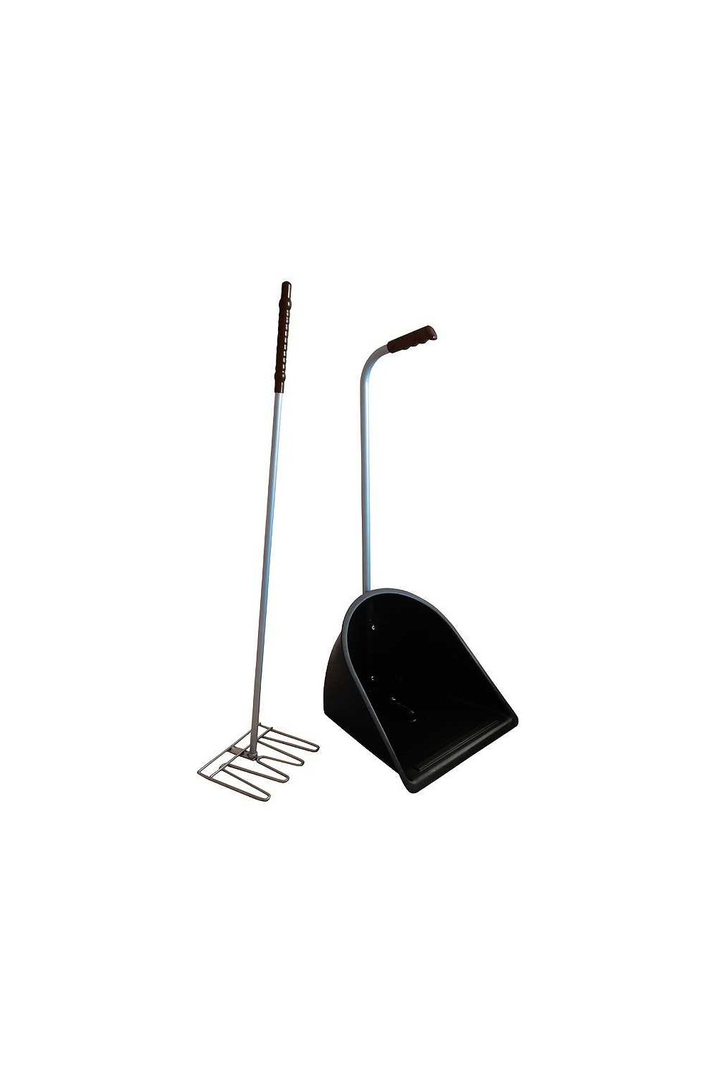 Recogedor y rastrillo metálico para limpiar el establo. Mangos en material adherente para un mejor agarre. Medida del recogedor: 36 x 76 cm Los mangos del recogedor y del rastrillo están incluídos.