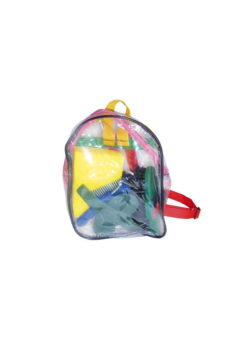 Mochila-kit de limpieza con cierre de cremallera ideal para niños/as en bonitos colores con 6 útiles para la limpieza del caballo. Está realizada en plástico impermeable y tiene correas para la espalda regulables.