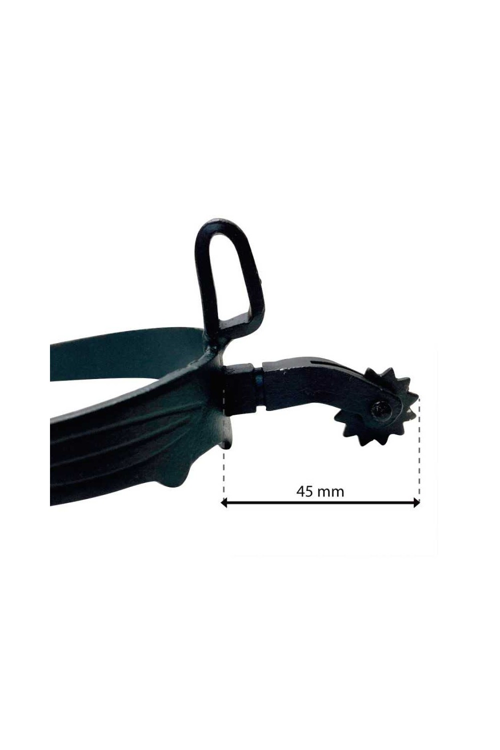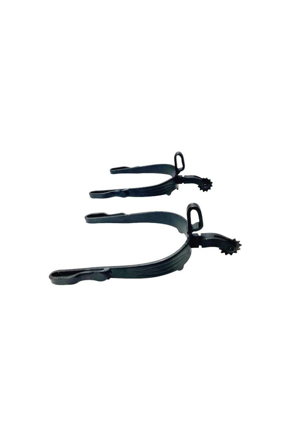 Espuela económica utilizada en la monta tradicional vaquera española, con acabado pavonado y ruleta vaquera con estrella de 12 puntas.