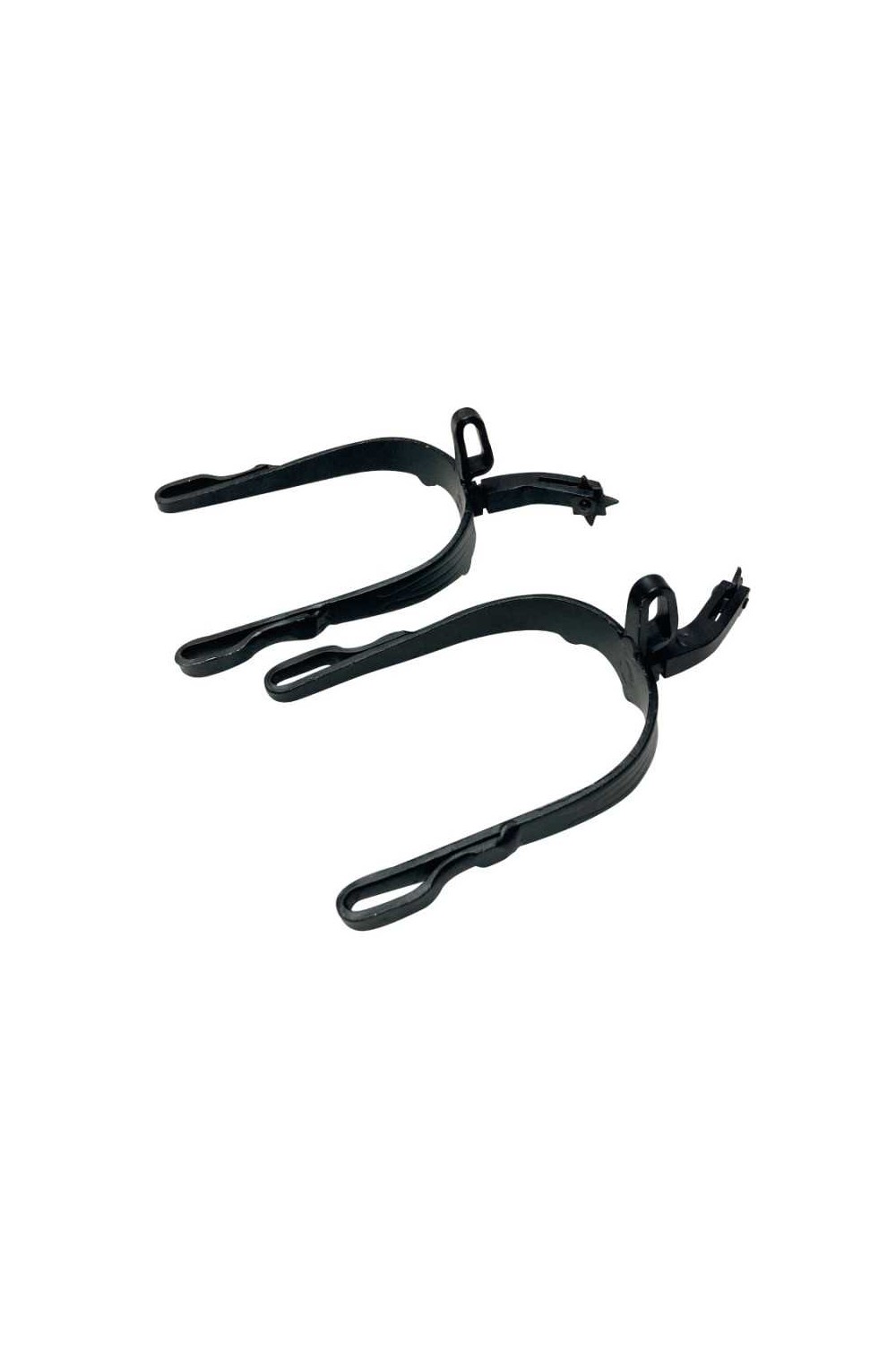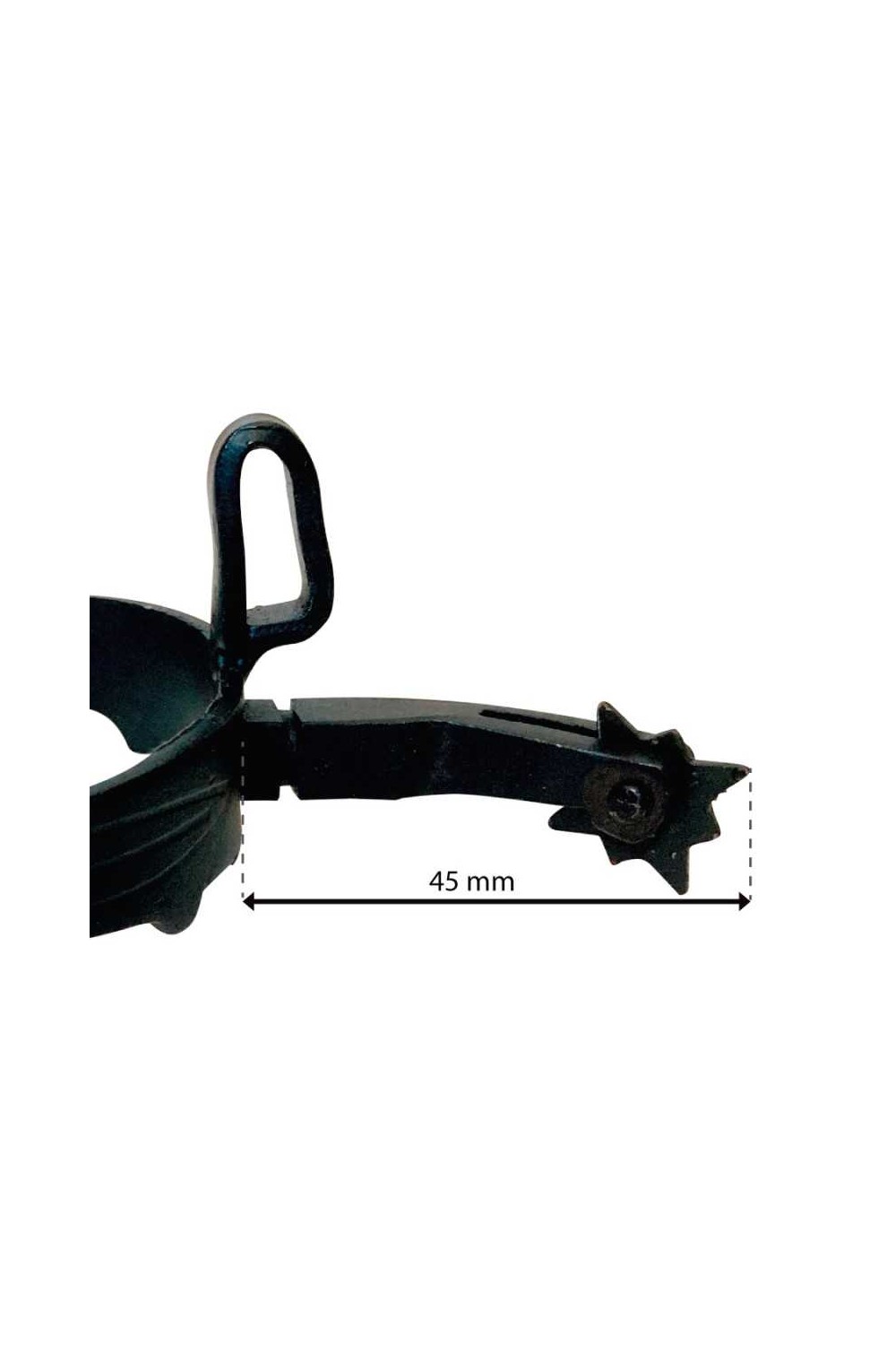 Espuela económica utilizada en la monta tradicional vaquera española, con acabado pavonado y ruleta vaquera con estrella de 8 puntas.