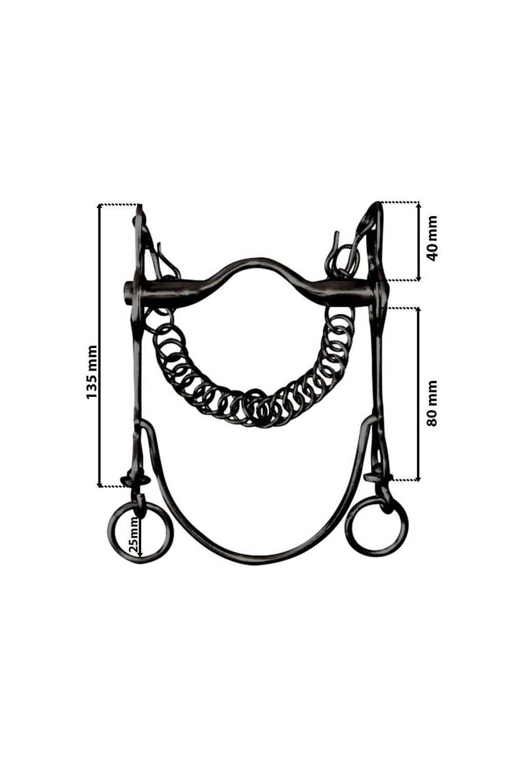 Bocado empleado en la monta tradicional vaquera española. Este modelo económico tiene un acabado pavonado, una embocadura suave y barra inferior curva. Incluye cadenilla.