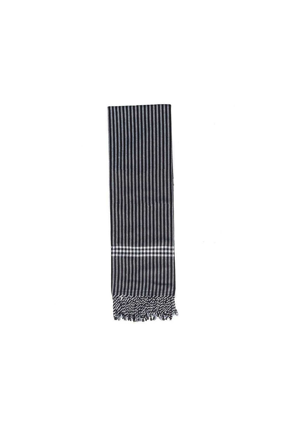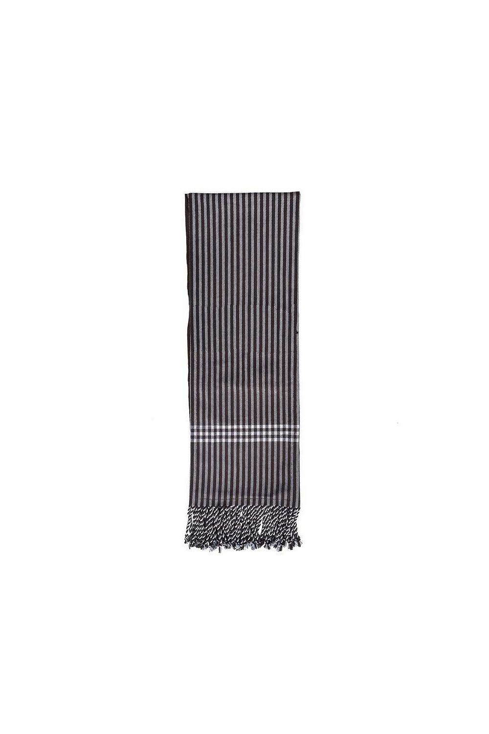Manta estribera de lona alistada sin bolsillos. Largo total (sin flecos): 140 cm.