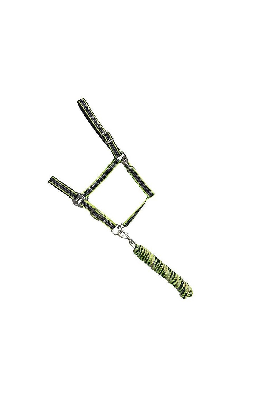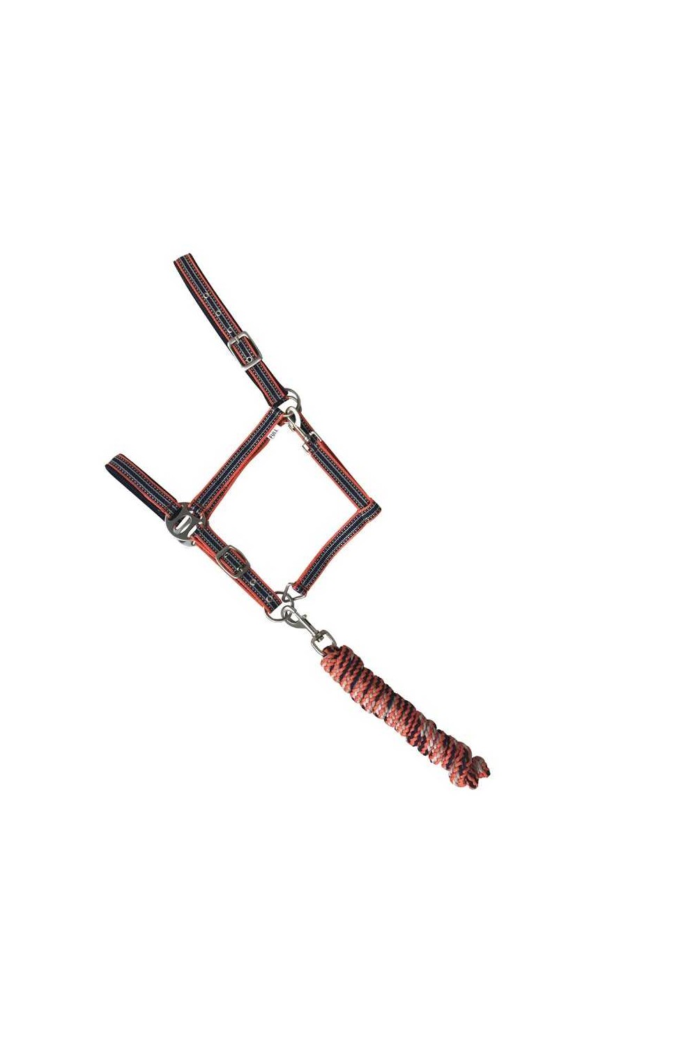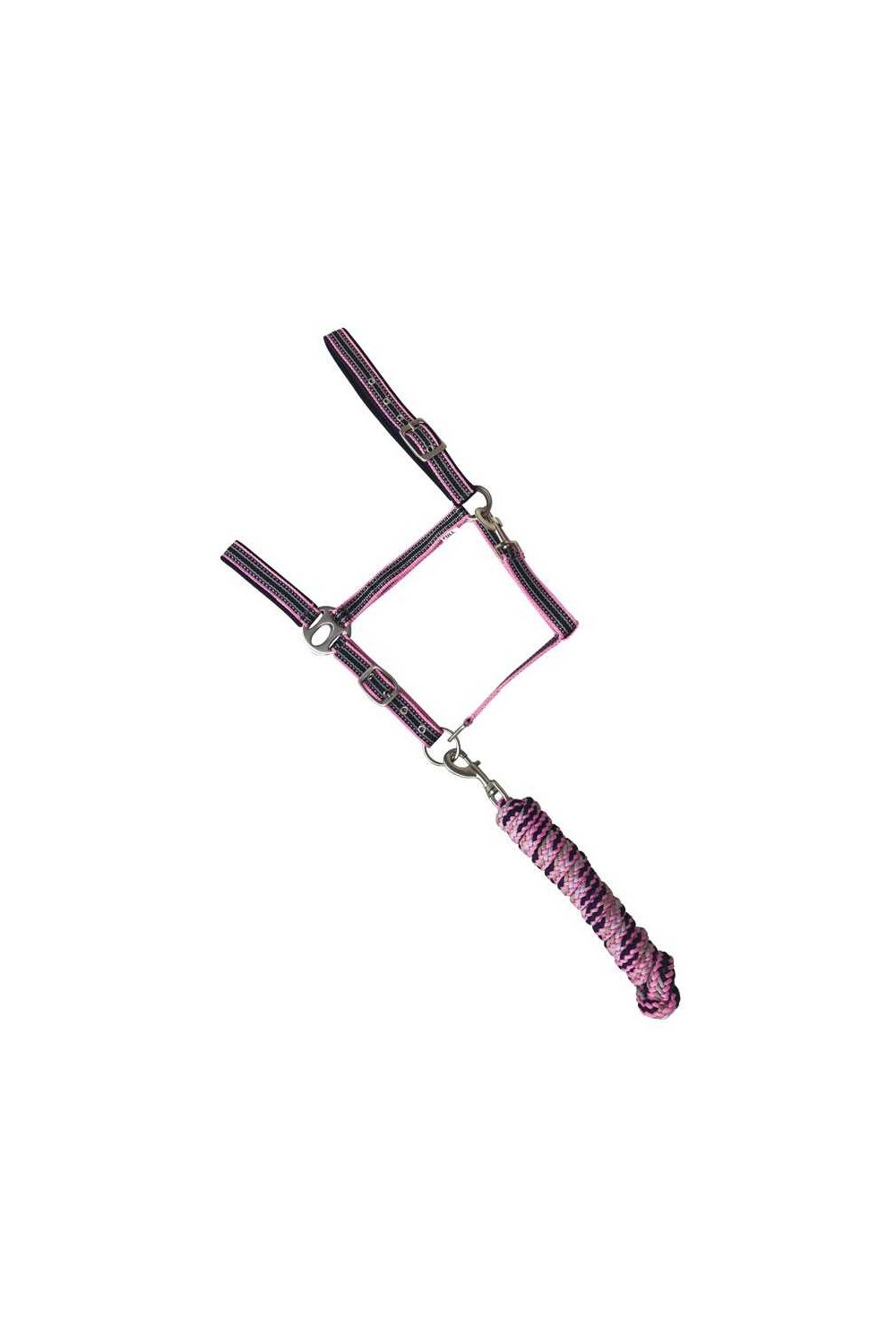 Las correas del testero y la muserola están forradas en suave acolchado de 6 mm para que no produzcan rozaduras al caballo. Cuenta con un mosquetón para colocarla fácilmente y 2 hebillas para regular el tamaño. Hebillaje en color plateado. Incluye ramal a juego que se engancha con mosquetón.