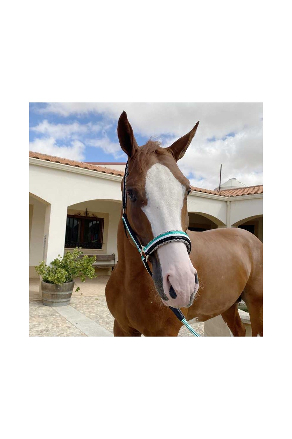 Cabezada de nylon doble plano con refuerzo de cuero en ojetes y reforzada con suave acolchado en bozo y testero. Hebillas de estampación irrompibles.