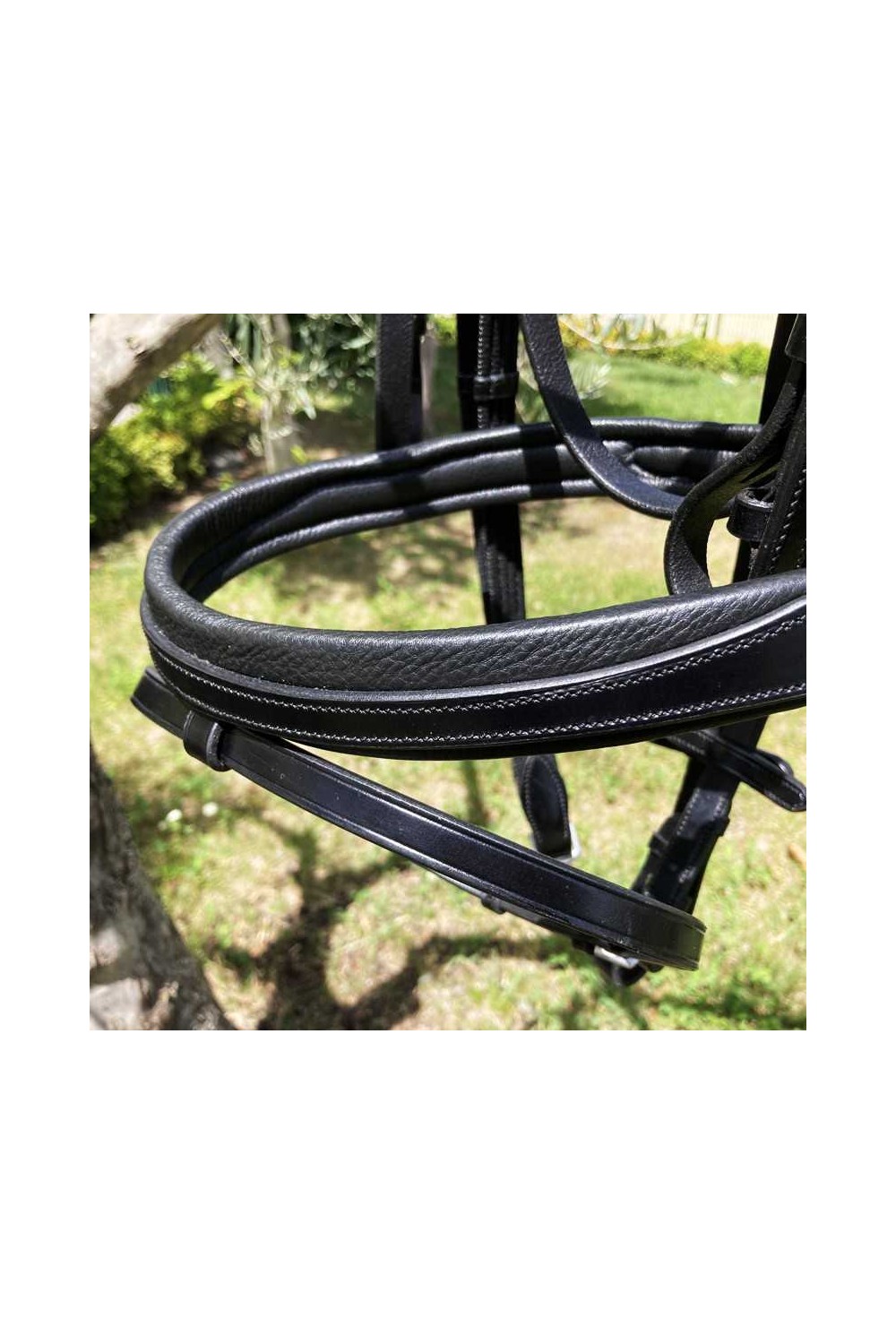 -Fabricada con cuero inglés de primera calidad extra suave -Acolchada en muserola, frontalera y testero -Riendas de lona y cuero con cierre de alubia -8 puntos de ajuste Filete no incluido