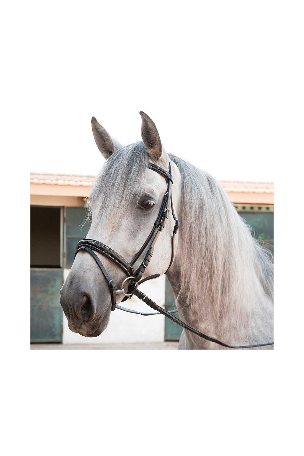 Cabezada realizada en cuero de primera calidad, con puntadas en contraste. Frontalera, muserola y riendas alomadas y decoradas con motivo pespunteado. Riendas con goma antideslizante para un mejor agarre.