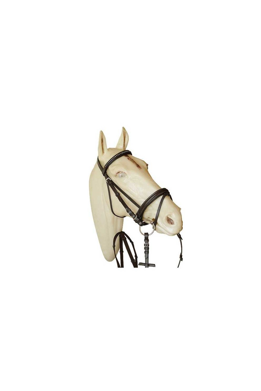 Cabezada muy completa, con cierrabocas y ahogadero. Con bonita frontalera decorada con una hilera de brillantes de lado a lado.