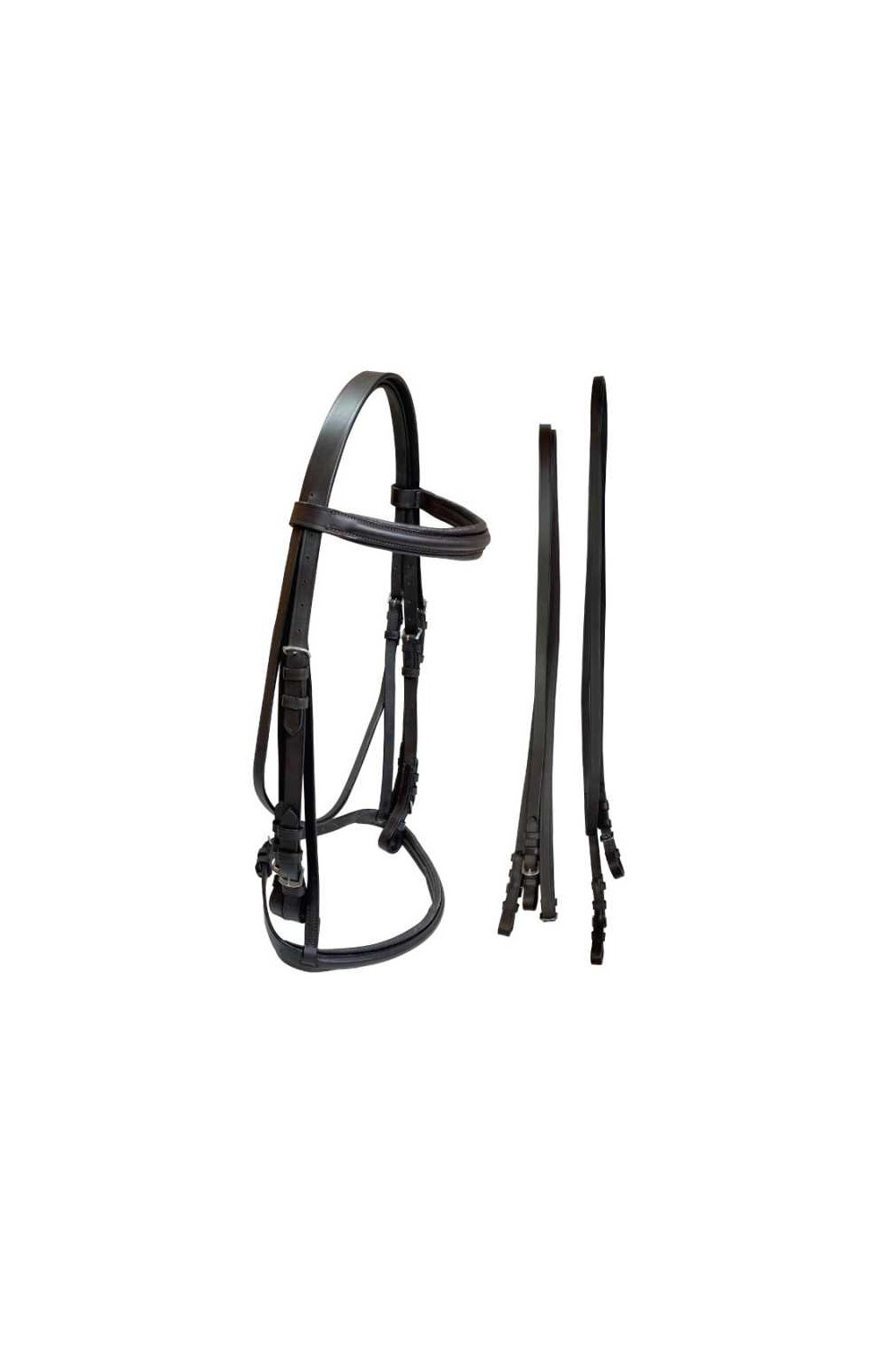 Cabezada de doma para filete y bocado con doble rienda y muserola ancha.