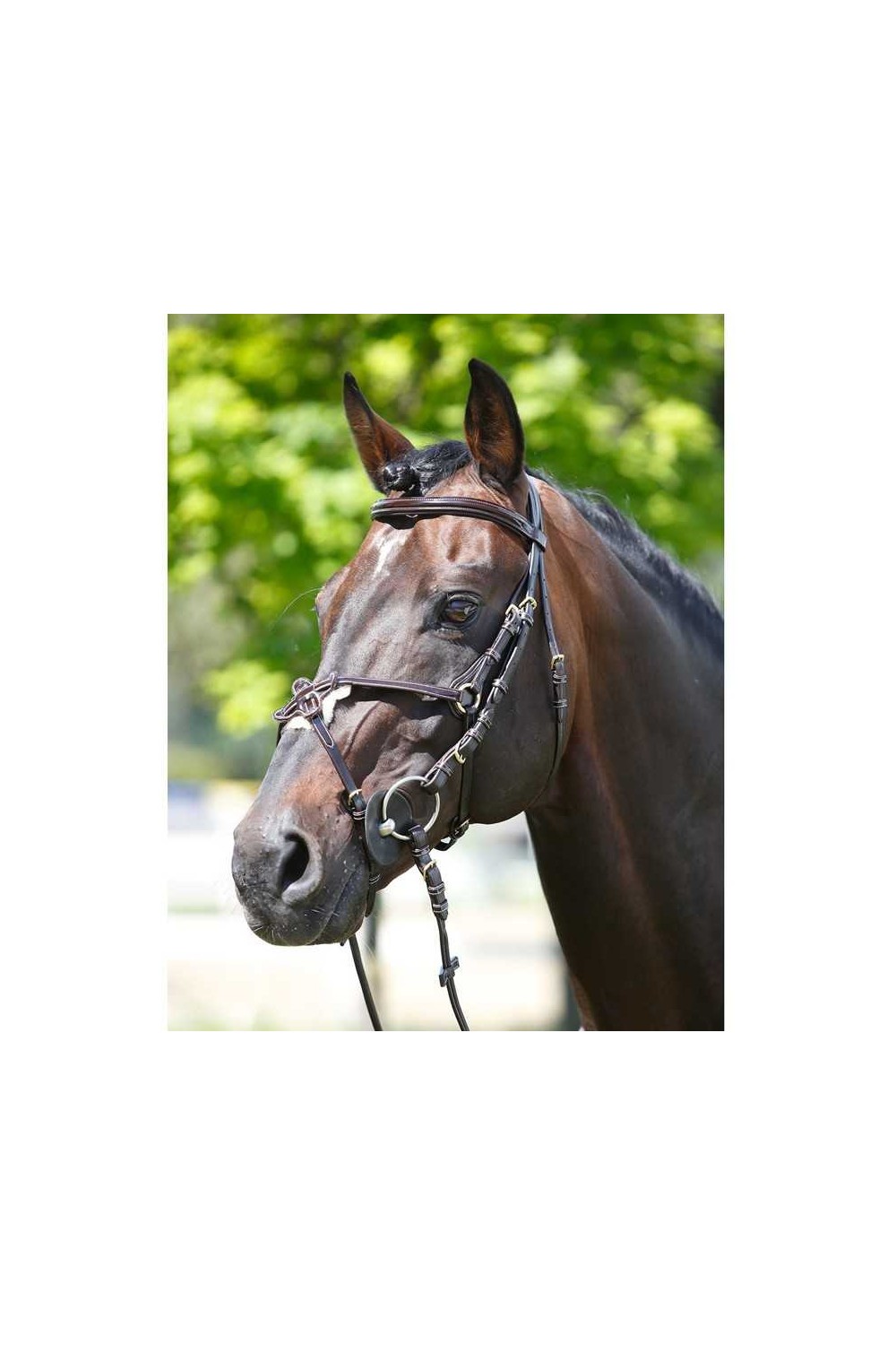 Realizada en cuero 100% de curtición vegetal, sin cromo, sin sustancias nocivas y no alergénico. Equipada con muserola cruzada y frontalera en charol, riendas con forro de goma suave, borreguillo natural de protección desmontable mediante velcro.