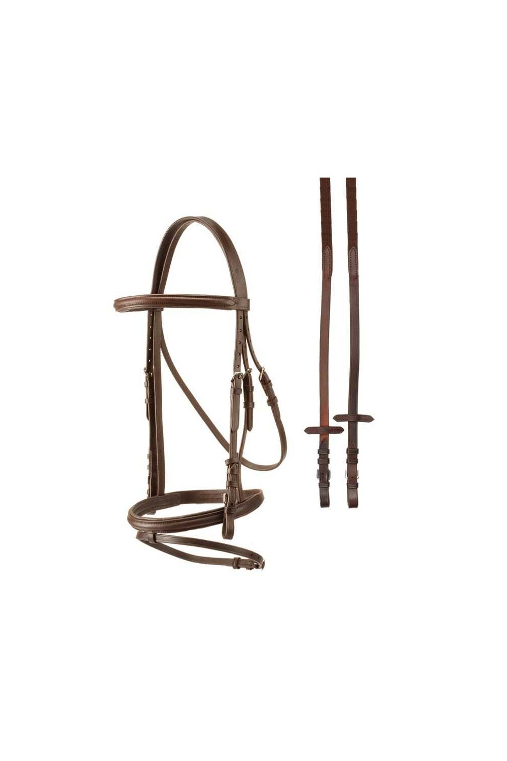En cuero con frontalera y muserola inglesas, riendas de lona, hebillas acero inoxidable. Lí­nea económica.