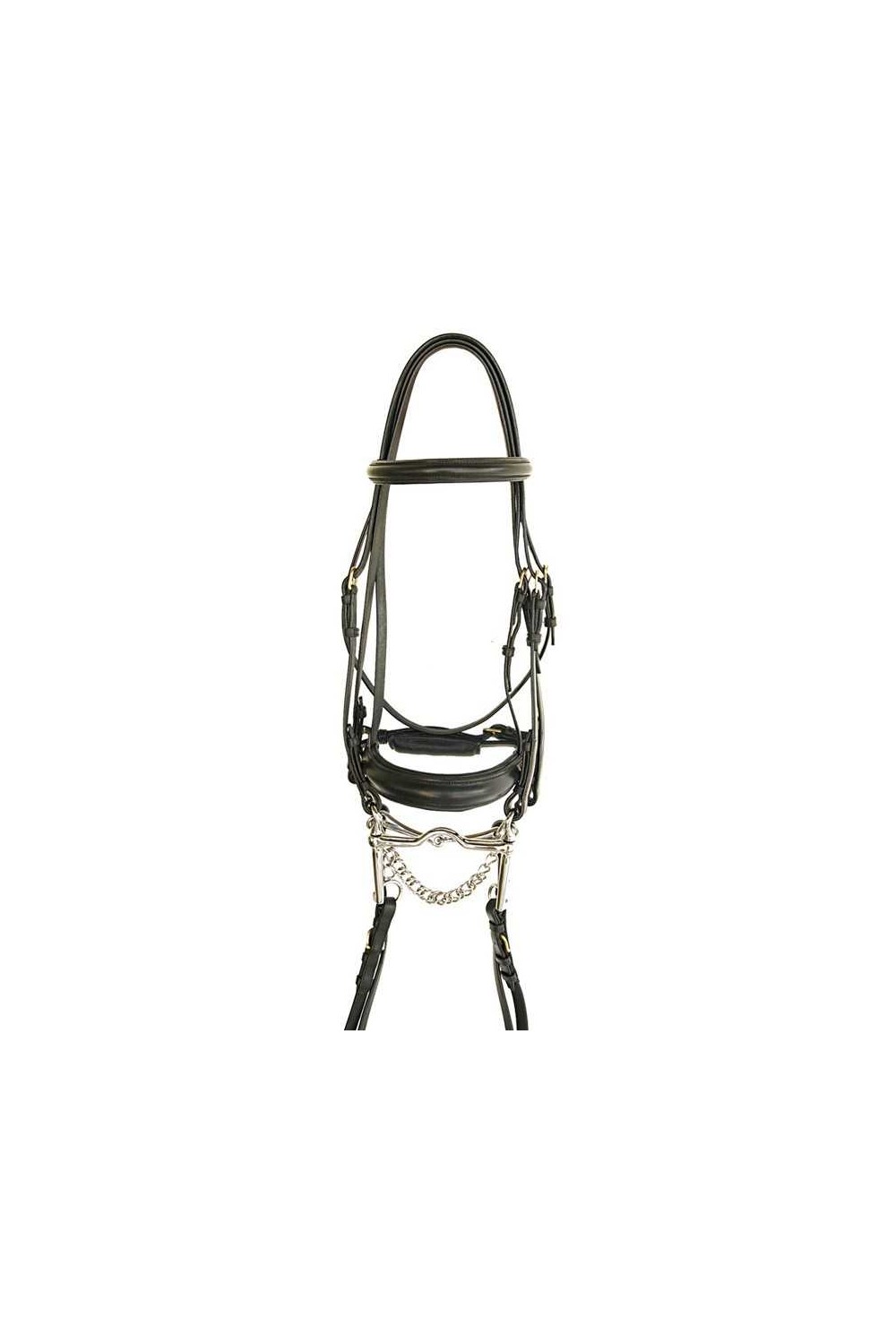 De cuero, para bocado y filete con muserola doble regulación, acolchada en cuero. Montantes con ganchos, dobles riendas lisas y hebillas en acero inox.