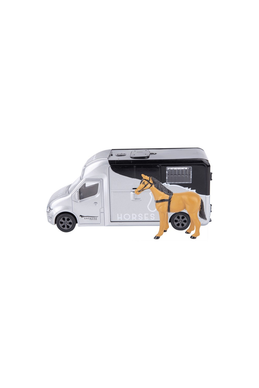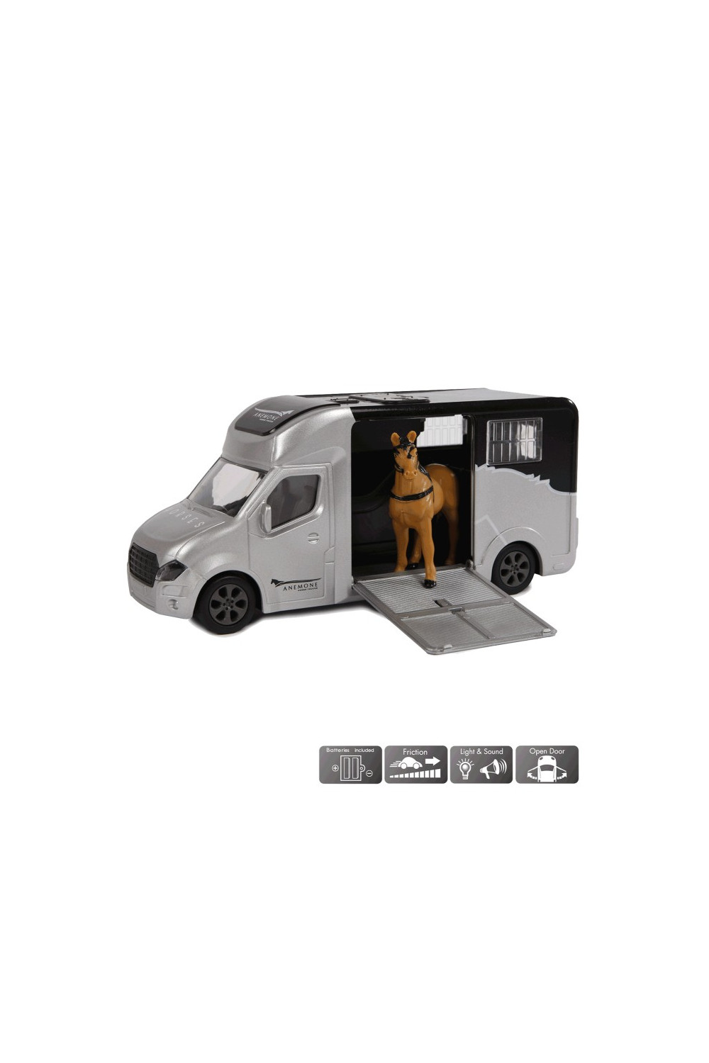 Juguete en forma de vehículo con motor pullback. En el remolque hay luz y tiene sonido. Caballo inclusive. Pilas incluidas. Paquete para regalo.