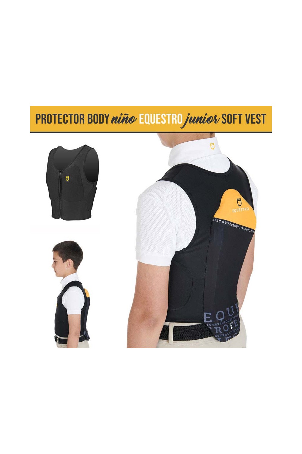 El protector está decorado con el logo de Equestro tanto en el pecho como en la espalda. Dispone de cierre con cremallera y cintura elástica que asegura la estabilidad.