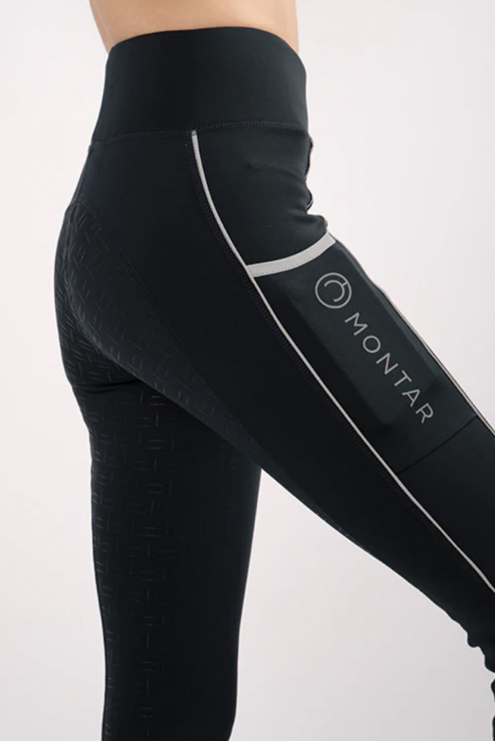 Las mallas de invierno ajustadas y con detalles reflectantes están hechas de un material de calidad con capacidades a prueba de viento en un tejido grueso y suave. Tienen una impresión de silicona completa para un agarre mejor y bolsillos para tu smartphone.