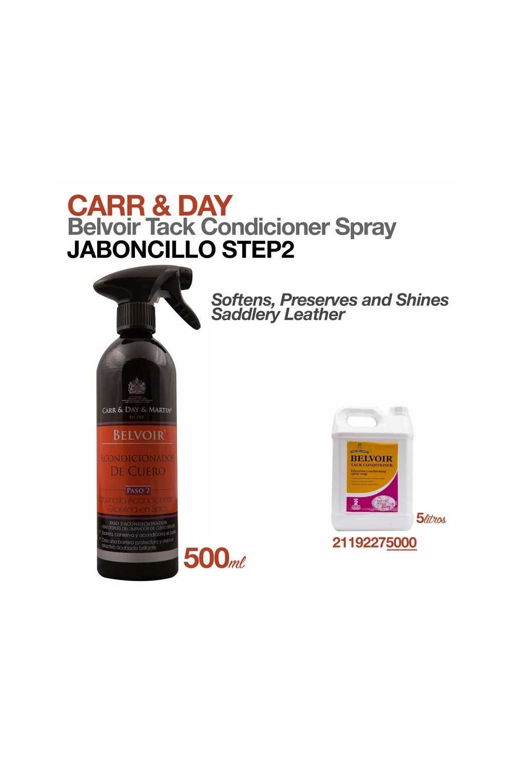 Belvoir Tack Conditioner contiene una mezcla de aceite de coco y glicerina para suavizar, preservar y acondicionar cueros de guarnicionería, y prolongar su vida útil.Para mejores resultados utilizar como segunda fase del proceso de mantenimiento, después de una limpieza profunda. APLICACIÓNPulverizar uniformemente sobre la superficie del cuero limpio y sin grasa, y frotar bien. Una vez seco, dar brillo con un paño suave. Utilizar con regularidad para obtener mejores resultados. No es adecuado para anilinas, cuero sin tratar, ante o nobuck. Antes de usar, hacer una prueba sobre una sección poco visible. Ingredientes: Agua, hidróxido de potasio, aceites vegetales, solución de azúcar, glicerina, agente quelante, aceite de lavanda, aceite de citronela. Precauciones: Mantener fuera del alcance de los niños. Mantener el bote bien cerrado. Mantener alejado del calor. No fumar.Formato: 500 ml., 5 litros.
