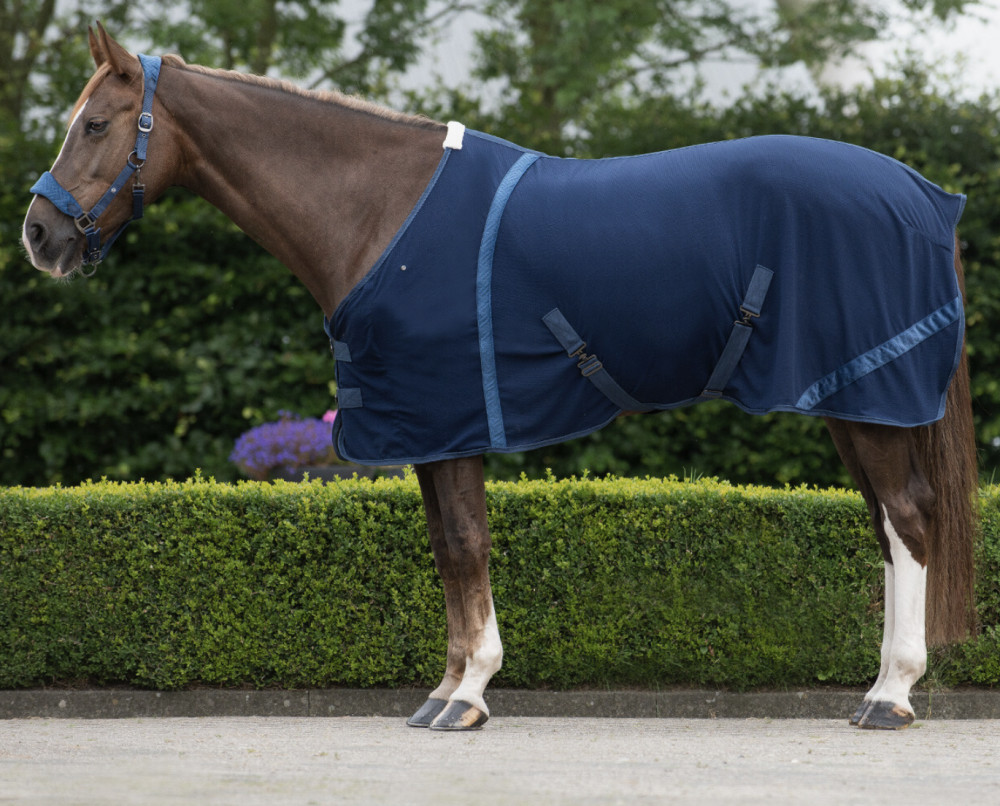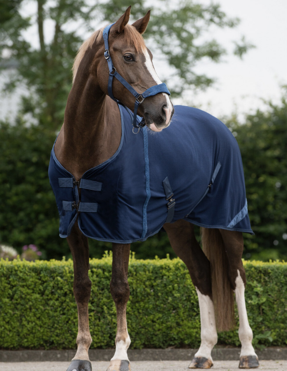 Esta manta de verano está hecha de una tela gofrada con la función de que sea transpirable para los días más calurosos. Presenta acabados en terciopelo y con tira decorativa a lo largo de los bordes. Tiene doble cierre frontal a la altura del pecho y un cordón por debajo de la cola.