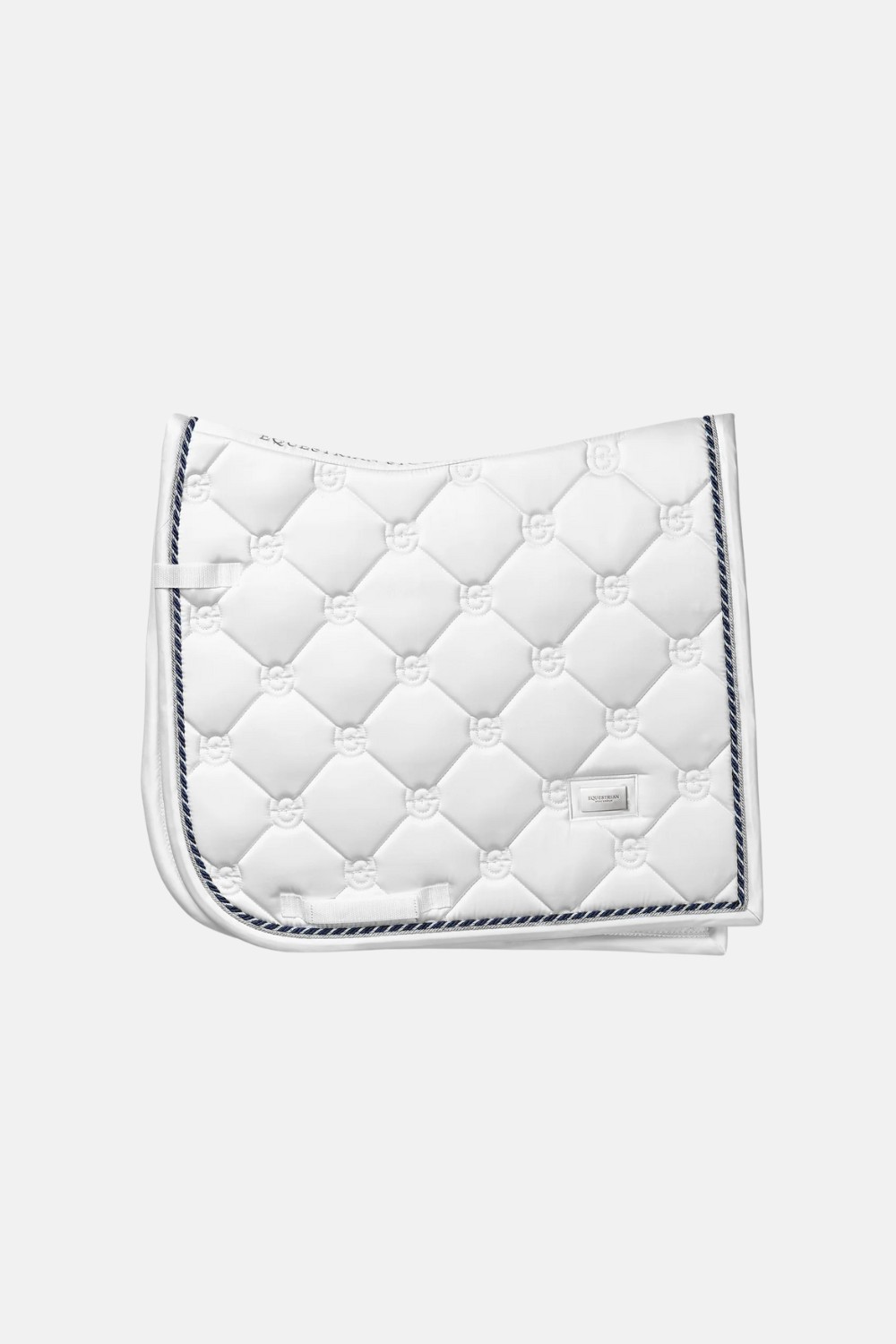 Logotipo acolchado sobre una placa metalizada en la parte inferior lateral de la mantilla. Dale clase junto a otros productos de la misma colección White Perfection  para un look completo tanto para el jinete como para el caballo.