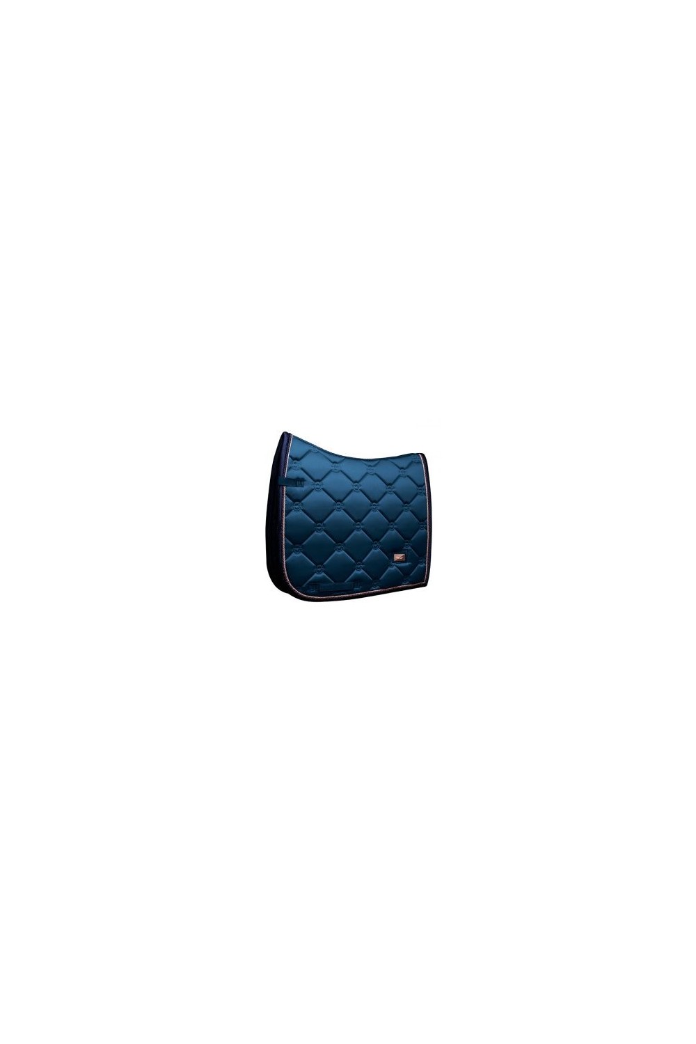 Estilosa mantilla perfecta para entrenar. Diseñada en color azul intenso brillante con el ribete en oro rosa y acabados en azul. Materializado en que sea resistente a la suciedad, con una buena ventilación que mantendrá a tu caballo seco durante las sesiones de entrenamiento más sudorosas.