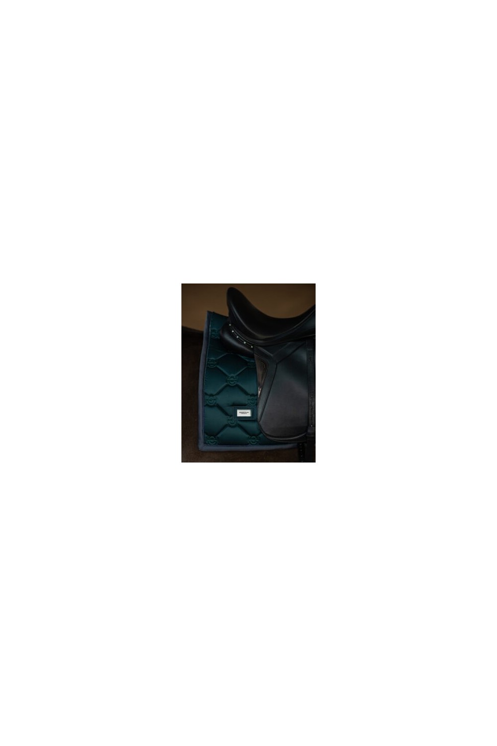 Logotipo acolchado sobre una placa metalizada en la parte inferior lateral de la mantilla. Dale clase junto a otros productos de la misma colección Dramatic Monday para un look completo tanto para el jinete como para el caballo.