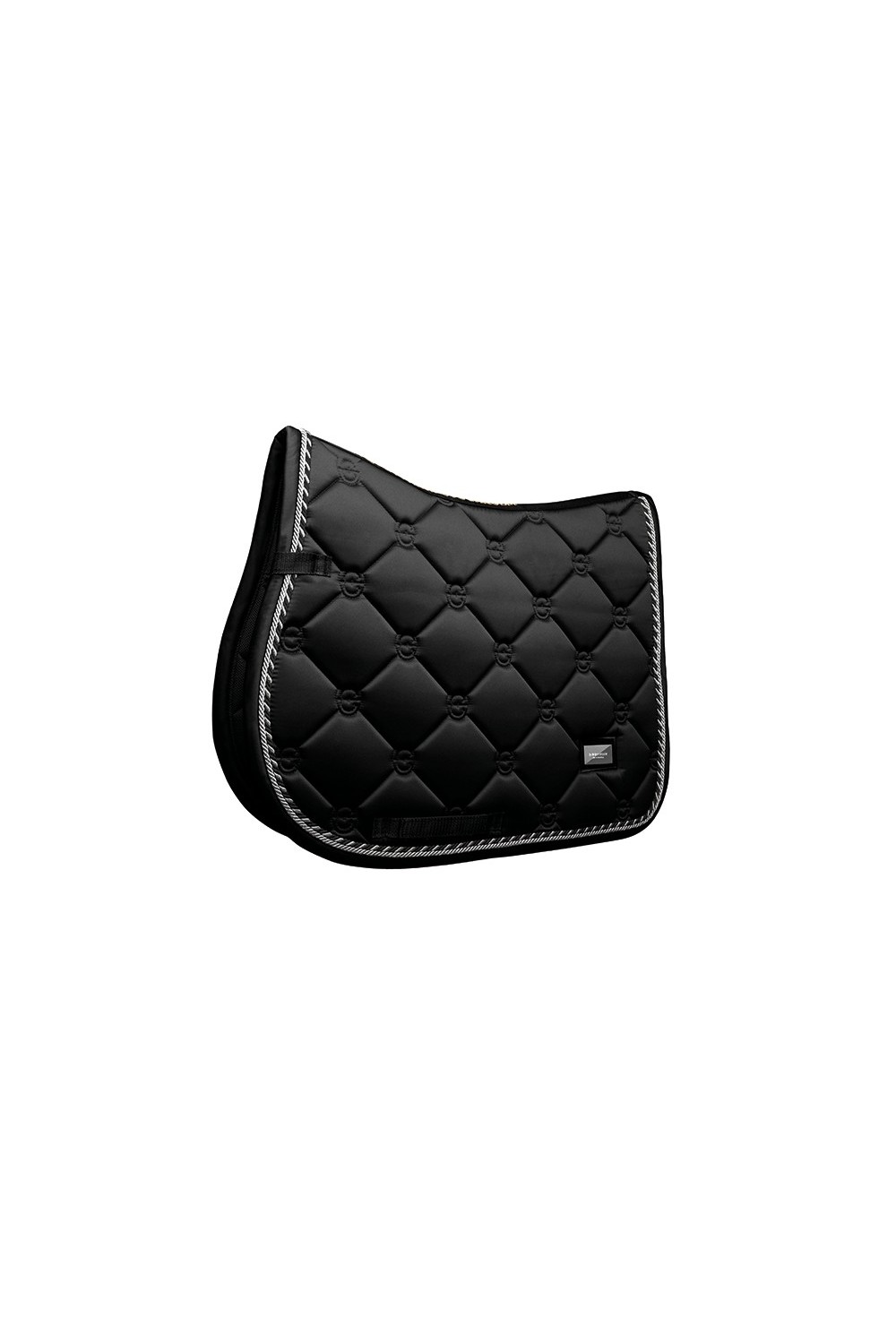 Logotipo acolchado sobre una placa metalizada en la parte inferior lateral de la mantilla. Dale clase junto a otros productos de la misma colección Black Edition para un look completo tanto para el jinete como para el caballo.