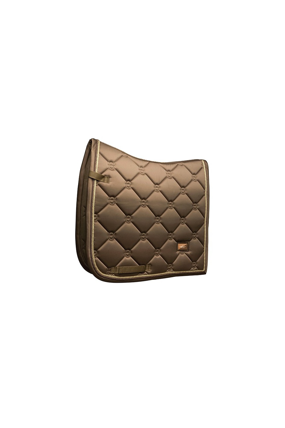 Logotipo acolchado sobre una placa metalizada en la parte inferior lateral de la mantilla. Dale clase junto a otros productos de la misma colección Champagne para un look completo tanto para el jinete como para el caballo.