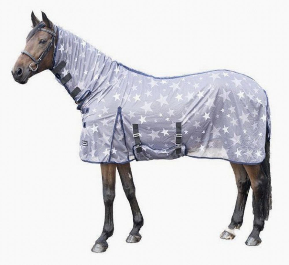 Manta anti - moscas para la protección del caballo contra los insectos. Tiene un ajuste óptimo de modo debido al ancho adicional que compone en el cuello. Muy resistente e irrompible. Lleva una correa para la cola. Protección de cuello fija con cierre de velcro y en nuca para unir a la cabezada o a una máscara de moscas. Protección de barriga mediante unas hebillas como en la zona del pecho.