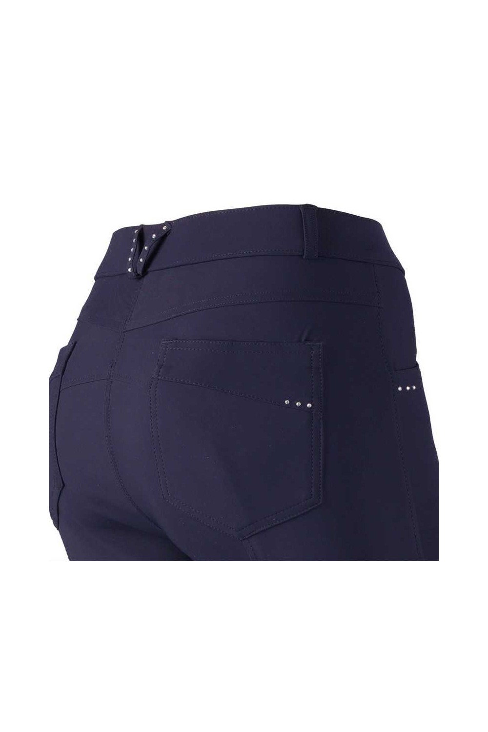 Asiento con forma, adornos de diamantes de imitación en los bolsillos delanteros, bolsillos traseros y trabilla central, parches de silicona en las rodillas, tobillo elástico.