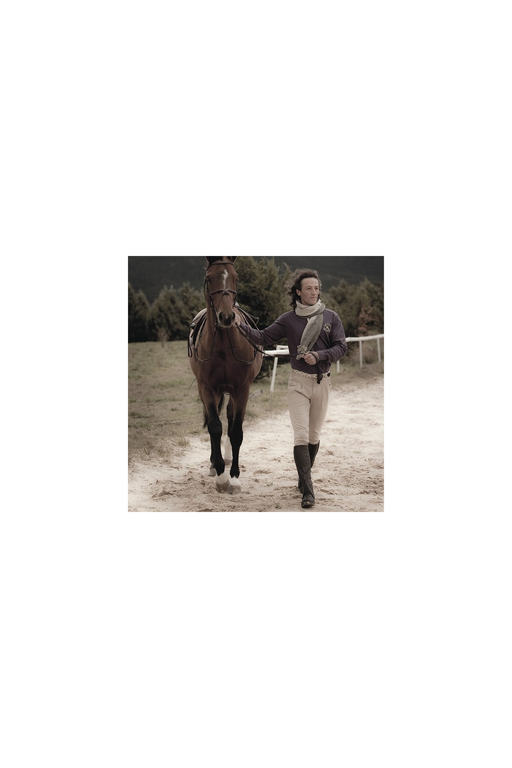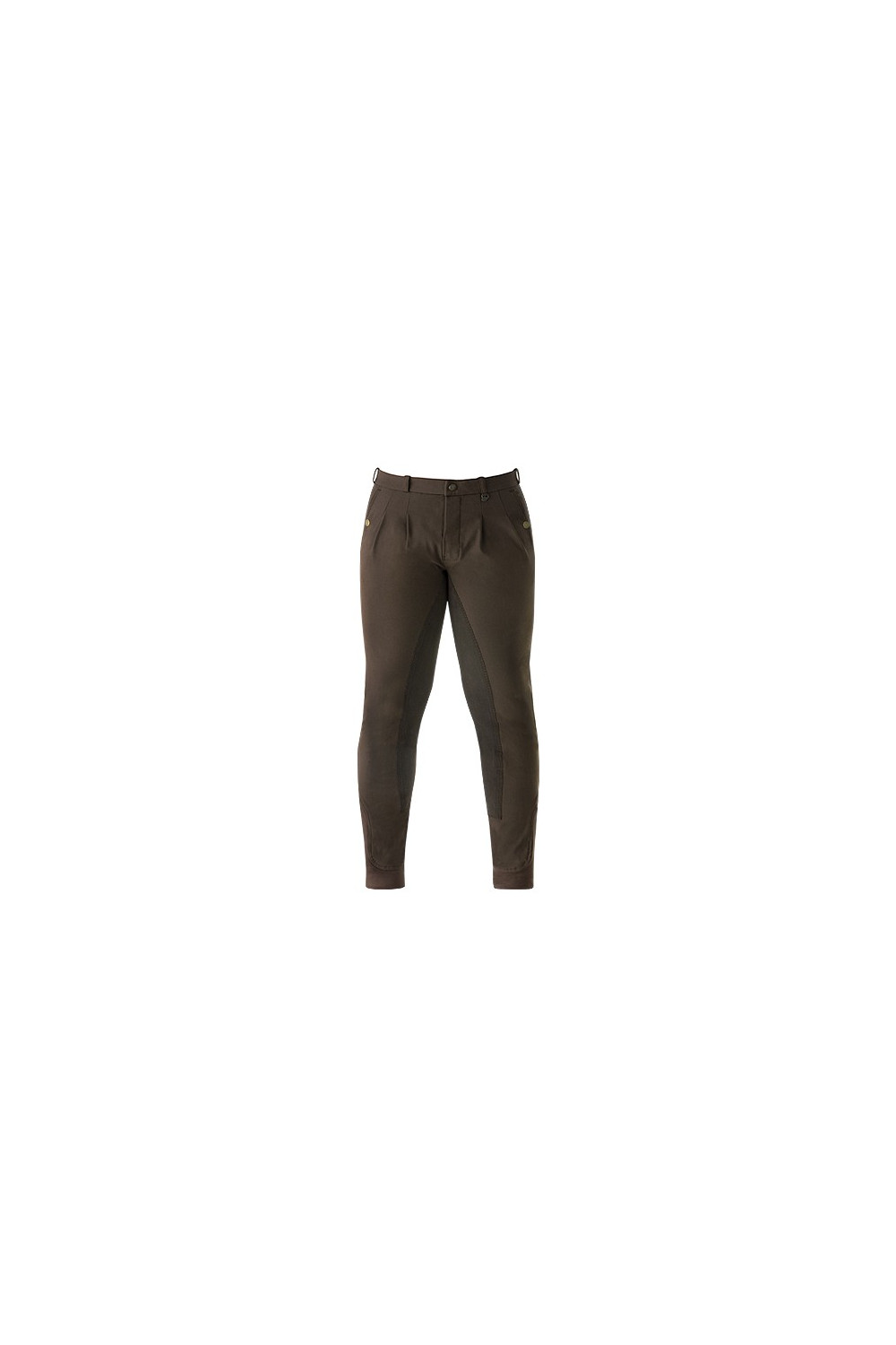 Pantalón hombre con culera de cuero sintético y con pinzas y dos bolsillos frontales laterales con cierre de corchete.
