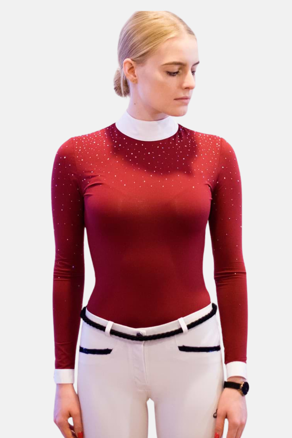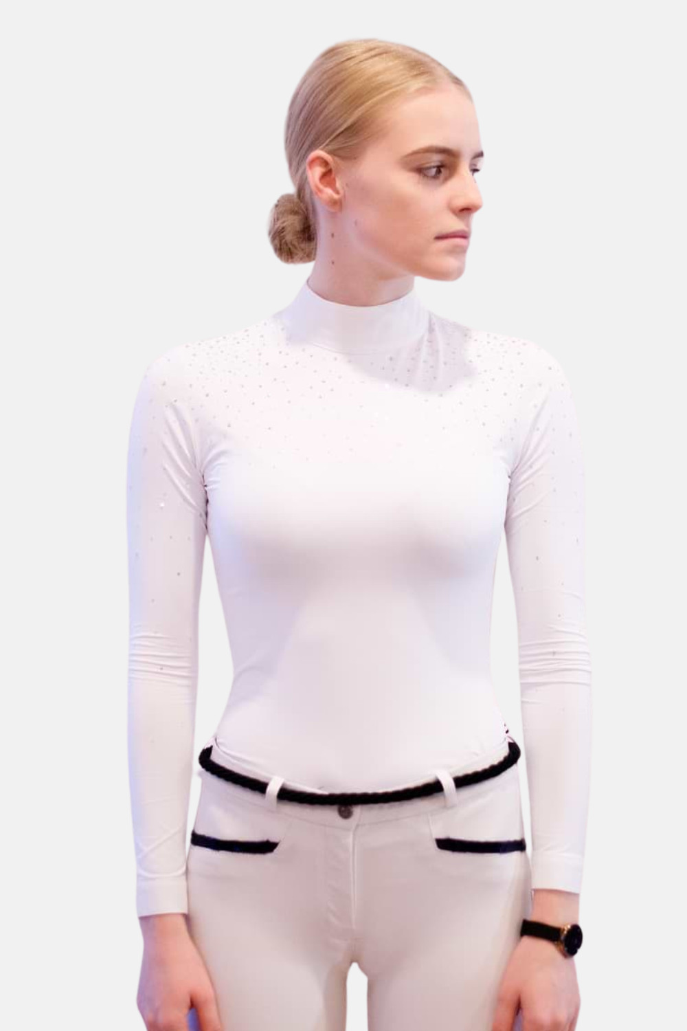 Diseñado en cristales que se encuentran esparcidos sobre el polo, garantizando un alto brillo y un gran efecto. Tiene detalles encantadores como los botones decorativos y un cuello que se complementa con un delicado bordado dorado.