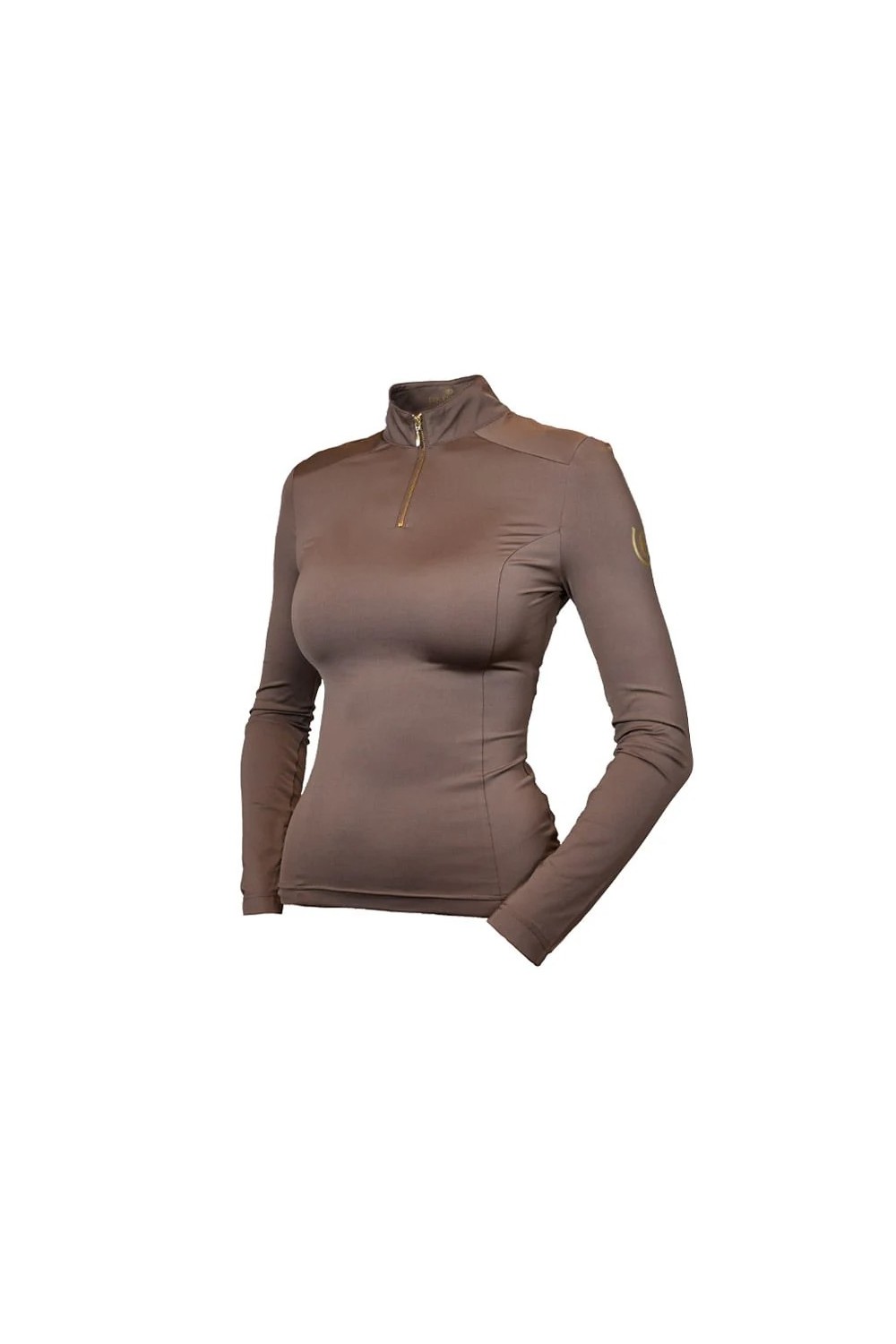 La parte superior está compuesta de un material fino, muy transpirable y de secado rápido con la finalidad de tener una sensación refrescante. Lo que tiene este Base Layer que lo hace diferente a los demás es su factor de protección UV que protege del sol y al mismo tiempo enfría la temperatura de la piel en 1-2ºC. Además se compone de un material que contiene poso de café reciclados para el control de los olores a la hora de practicar el deporte. Es de talle ajustado por lo que aporta un detalle estético lujoso. Logotipos situados en la parte de la espalda, en el brazo izquierdo y en el hombro derecho grabados en color oro. Lo puedes combinar con todos los productos de la colección Champagne tanto para el jinete como para el caballo.