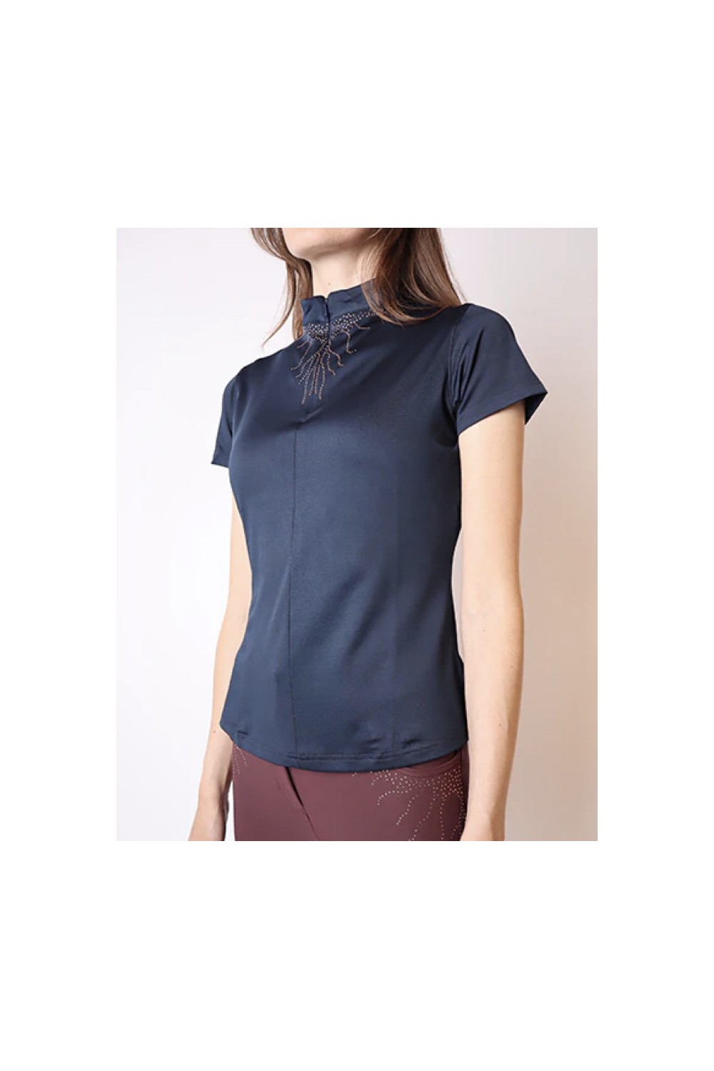 El polo Femka tiene un aspecto muy sofisticado con impresionantes lagrimas de cristal de oro rosa alrededor del cuello y la parte superior del pecho. Los lirios de cristal de oro rosa solo están separados por una cremallera en el cuello perfectamente oculta. El polo está hecho del tejido MON-TECH altamente funcional que garantiza una sensación altamente transpirable y cómoda durante el tiempo que montas. Combina perfectamente con los pantalones Femka. Esta compuestos por:  93 % de micropoliéster, 7 % elastano, - Tejido Mon-tech, ajuste femenino, transpirable, tacto suave, absorbe la humedad