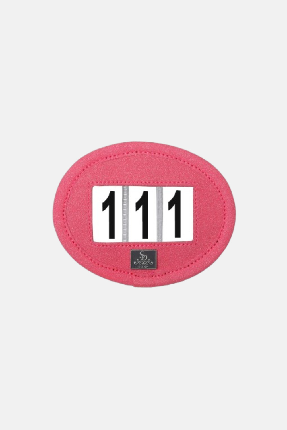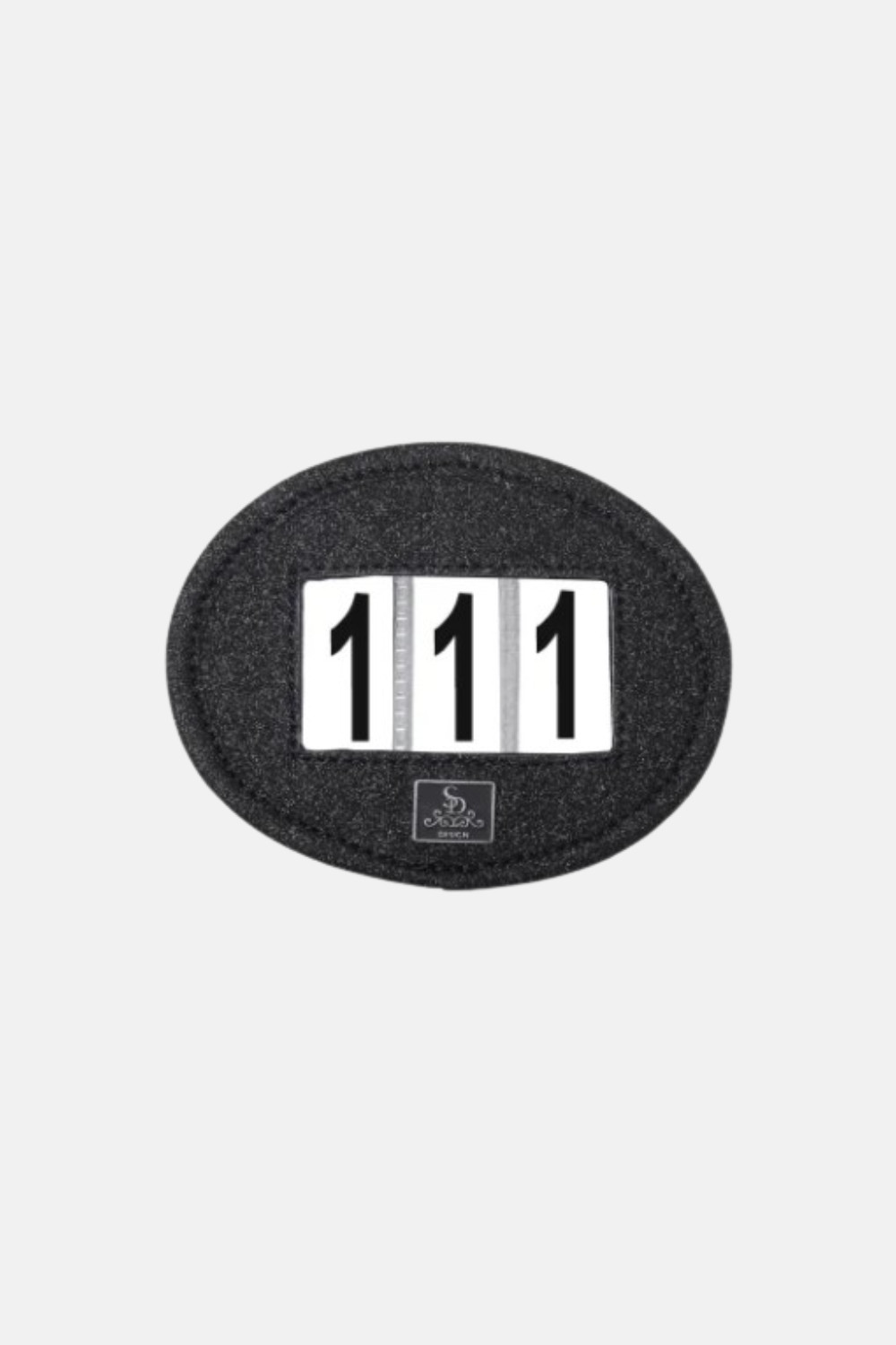 Portanúmeros para las competiciones diseñado en brillo. Su cierre se hace mediante un imperdible y además de una correa con botón. Su parte trasera es hecha en velcro de forma que se pueda coser en la mantilla.