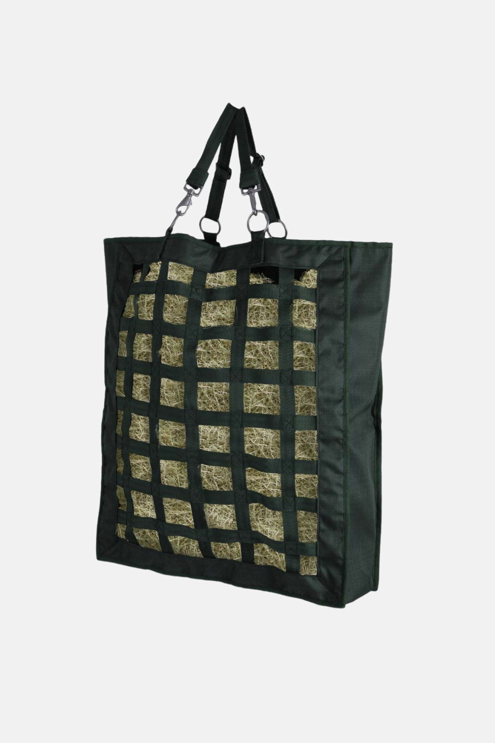 Equipado con una red con bandas anchas. Equipada con 4 anillas con hebillas ajustables y mosquetones para colgar la bolsa. Las hebillas también pueden retirarse de las anillas para cerrar la bolsa de heno.