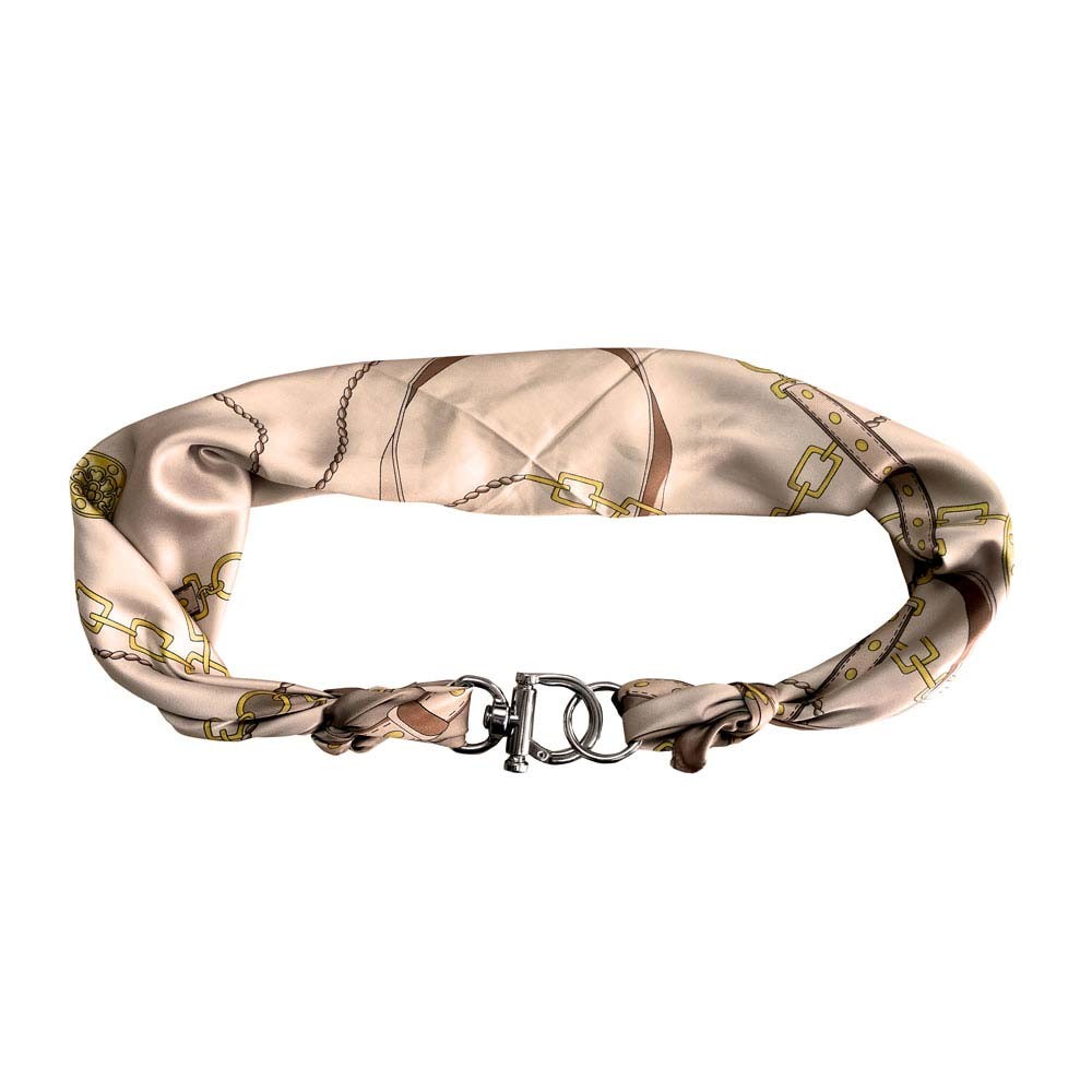 Pañuelo italiano fabricado en poliéster con terminaciones metálicas y original cierre seguro en un extremo.