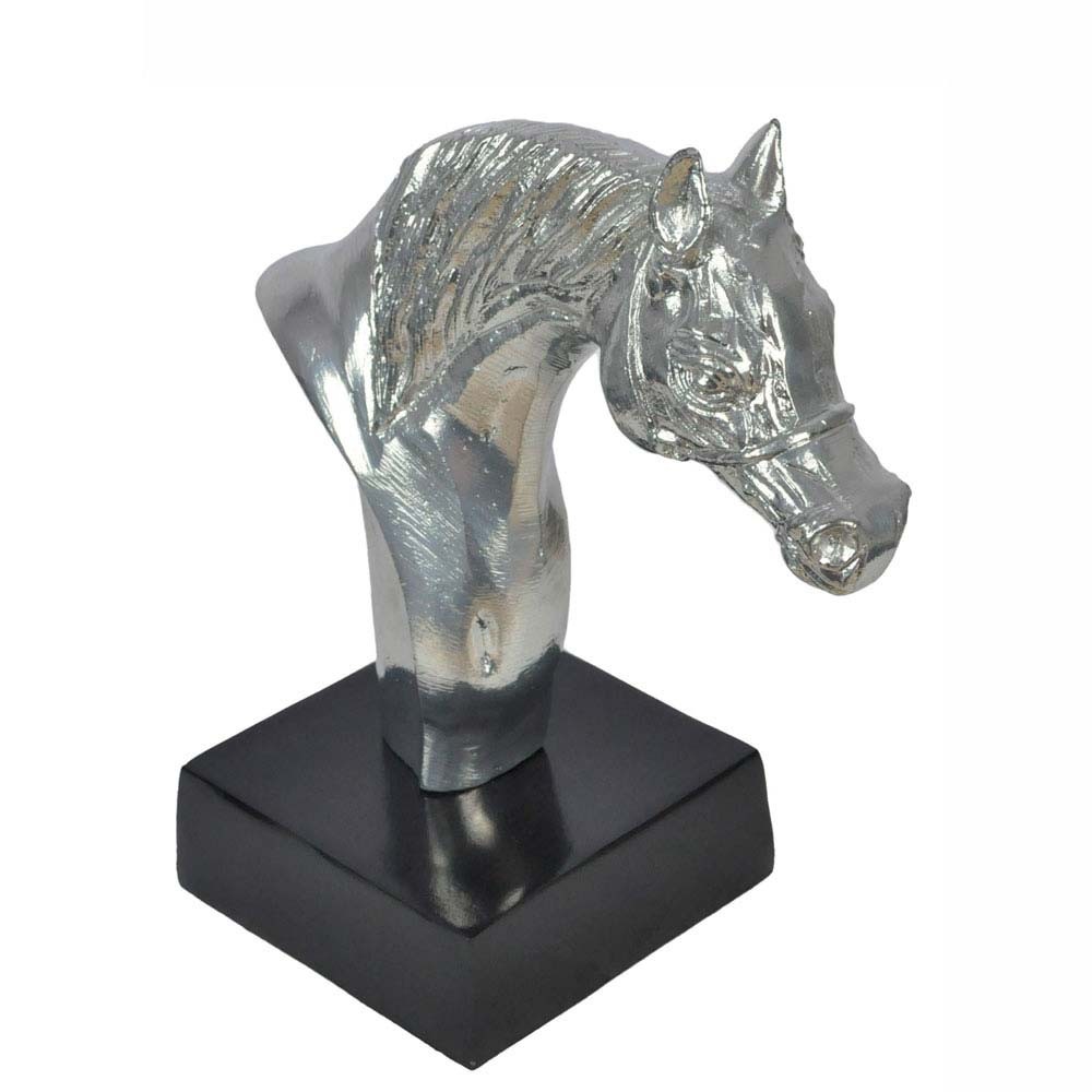 Trofeo figura de cabeza de caballo sobre peana negra de base.
