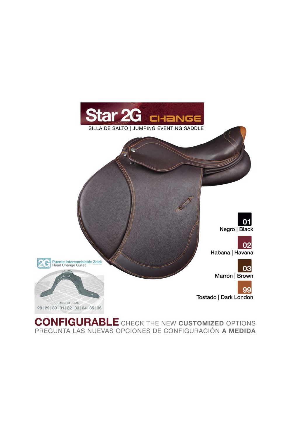 Por ejemplo, el modelo Star 2G CHANGE de la fotografía está fabricada en cuero marrón con el vivo, el hilo y el adorno de la cola tostado y el burlete en color marrón y configurada con la armadura CHANGE, el asiento extraconfortable (ver coste añadido ref. 00902), la opción de baste anatómico (ver coste añadido ref. 00903), baste rellenable multiposición (ver coste añadido ref. 00916) y latiguillos cortos y multiposición de salto (ver coste añadido ref. 00915).