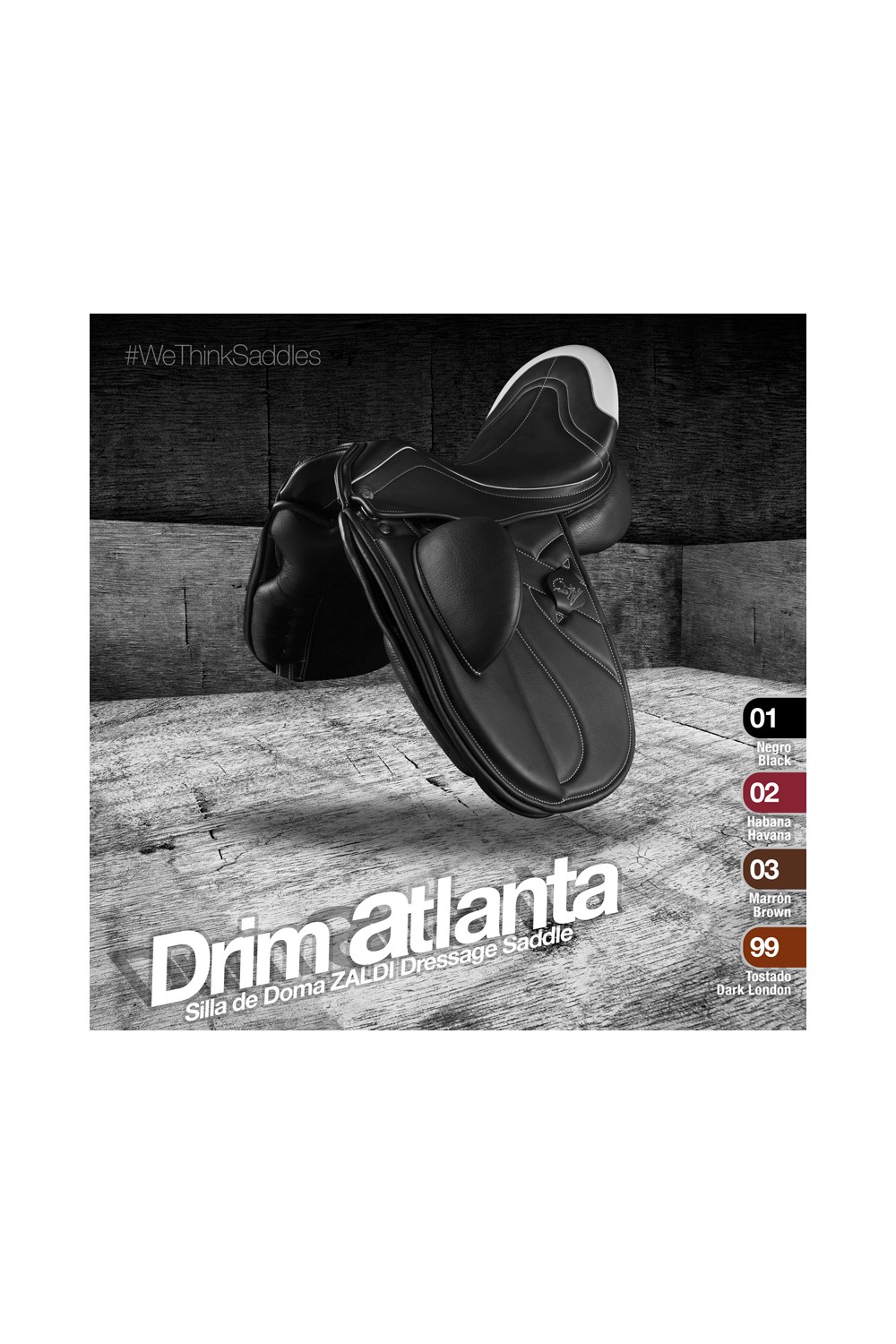 La silla de doma DRIM ATLANTA de la imagen está fabricada sobre una armadura CHANGE (puentes intercambiables) de doma profunda en material de alta tecnología (polipropileno EPDM) con garantía de 10 años. Anatómica TWO DENSITY de doble densidad (jinete +caballo), permite combinar características de rigidez, deformación y absorción de energía en varias superficies. La densidad Modo Caballo es utilizada en la zona inferior de la armadura que está en contacto con el dorso del caballo. Reparte la presión del peso del jinete de forma homogénea por toda la musculatura dorsal del caballo. En la parte superior está la densidad Modo Jinete (de 0,5 cm de grosor) muy elástica, absorbe el impacto del jinete y evita que afecte al caballo. La zona del contacto con el jinete se ha diseñado de forma ergonómica elevando las zonas laterales, que permiten liberar de presión la zona uretral del jinete, evitando problemas de salud posteriores, disminuye la presión permitiendo el correcto riego sanguíneo de la zona.