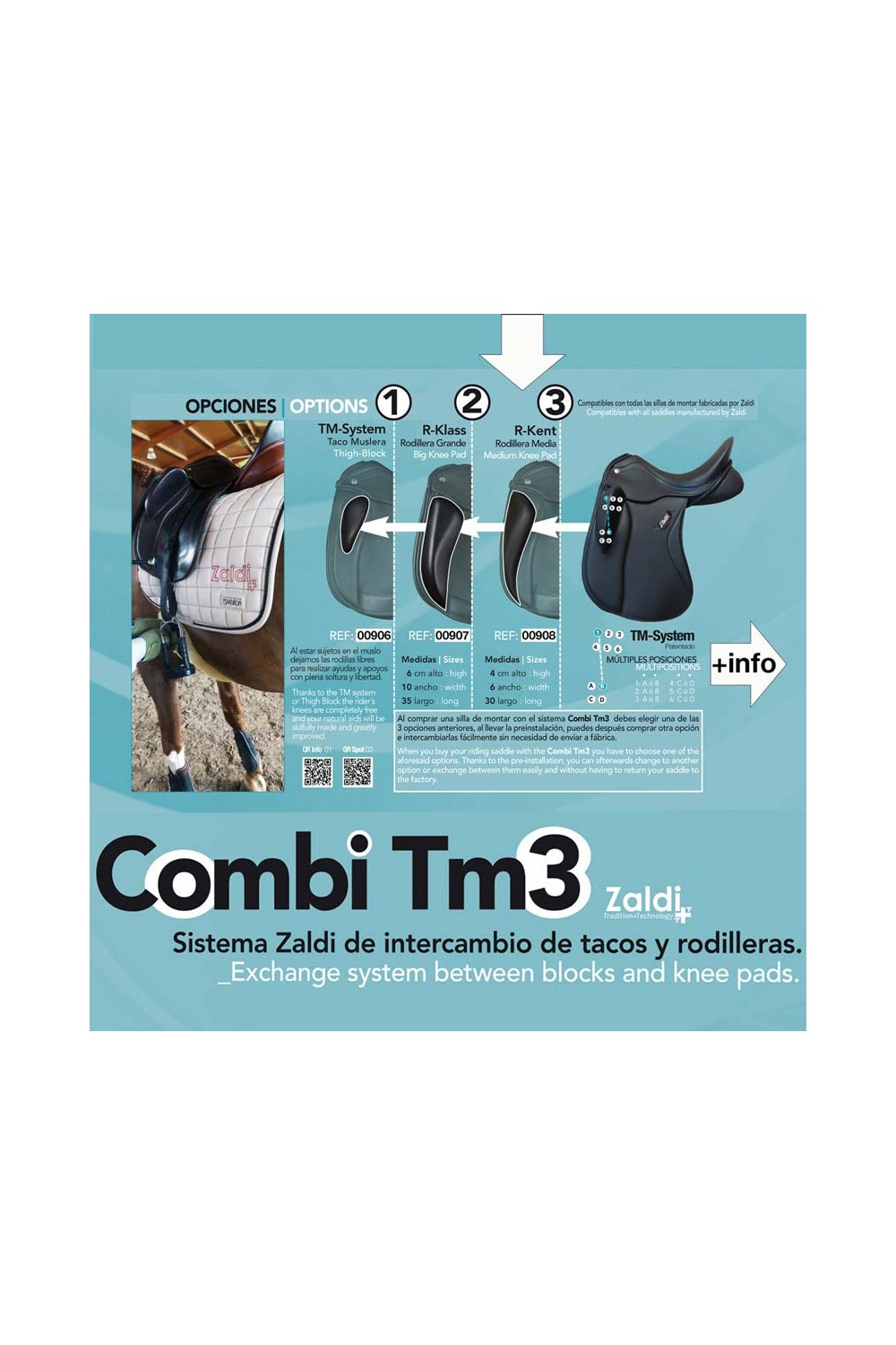 Combi Tm3, nuevo Sistema de Intercambio de taco-muslera a otras 2 rodilleras opcionales, con tecnología TM de ajuste por tornillos al faldón, patentado por Zaldi Sillas de Montar.